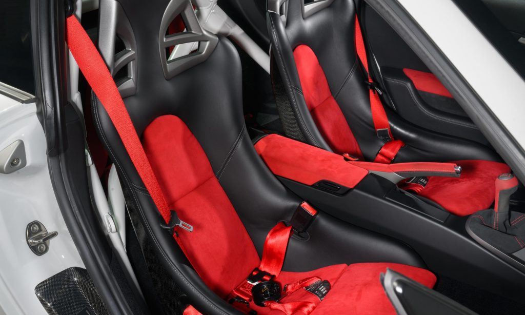 Háromküllős sportkormányán ott a piros középjelző, a karima pedig alcantara, hogy tapadjon hozzá a kesztyű. A hagyományos biztonsági öv mellett a kagylóüléseken ott lógnak a négypontos övek is, a hátsó ülés helyén pedig virít a fehér bukócső, mert ez tényleg döbbenetesen közel áll egy versenyautóhoz. Elég ránézni a légiesen könnyű felnik mögött ordító hatalmas fékekre és az alumínium konzolon fekvő hátsó szárnyra, valamint az apró aerodinamikai elemekre.
