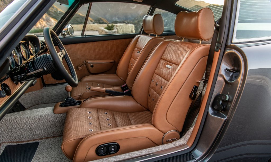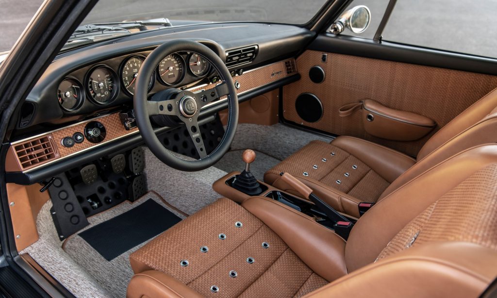 Rendkívül elegáns hangulatú a Singer 911-es beltere a bőrkárpitozással és a világos szőnyegezéssel. A műszerfal teteje sem műanyag, hanem fekete bőrrel húzták be, a pedálok és más kiegészítők pedig fekete eloxált alumíniumból készültek. Mahagóni váltógombja a 917-es versenyautót idézi.