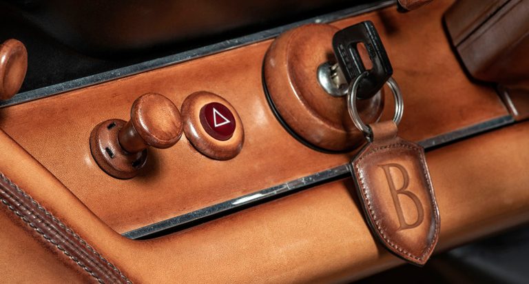 A 46 éves Porschében mindent bőrrel vontak be, amit csak lehetett, a kormánykeréken és az üléseken kívül az ajtóbelsőket és a műszerfalat, de még a csomagtartót és a motorháztetőt is. Az egyedi kivitelt a bőrbe nyomott Berluti logók jelzik.