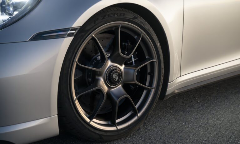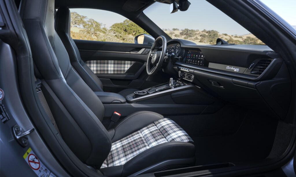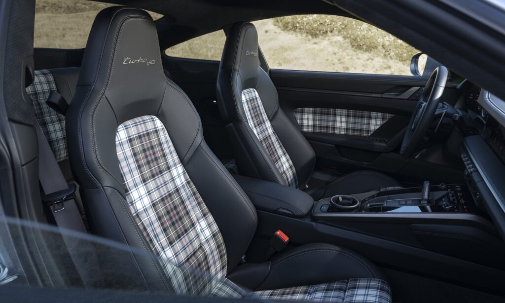 Kifejezetten a Turbo modellekhez kevert szürke árnyalat bukkan fel a központi anyás felniken és az emblémákon, de a biztonsági övek, a díszvarrások és a kezelőszervek is Turbonite színűek. A küszöbök szálcsiszolt alumínium betétjében az ötvenedik évfordulós logó világít, az adaptív sportüléseken és az ajtókárpitokon is tombol a retró hangulat, de a kockás szövet nagyon jól áll a 911-esnek. Mivel csak 1974 darab készül a Monterey Car Week-en bemutatott Porsche 911 Turbo 50-ből, ezért villámgyorsan gyűjtői ritkasággá érik.
