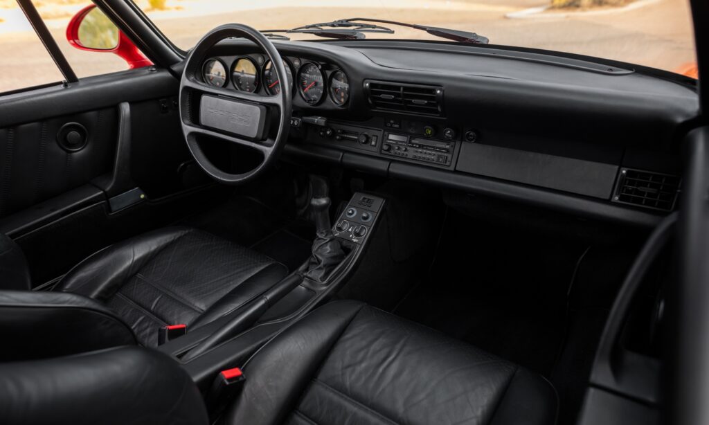 Fekete bőrüléses utastere szinte alig különbözik egy 911-esétől. Itt is öt kerek óra figyel a négyküllős kormány mögött, a vízszintes vonalak között pedig ott vannak a fűtéspanel és a rádió gombjai, felette a szellőzők. Végtelenül egyszerű az egész, de azért vannak jelei annak, hogy ez több, mint egy átlagos sportautó. A váltója előtt ott vannak a felfüggesztést állító kapcsolók.
