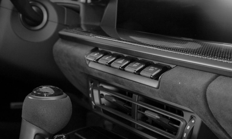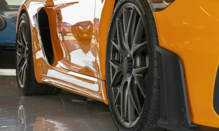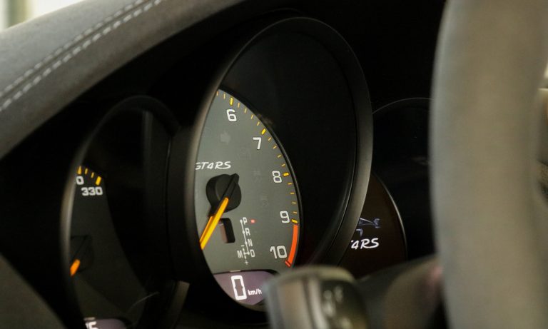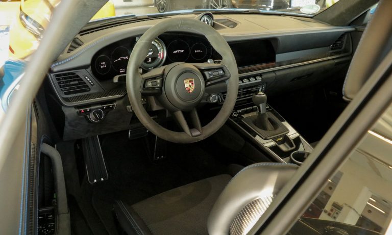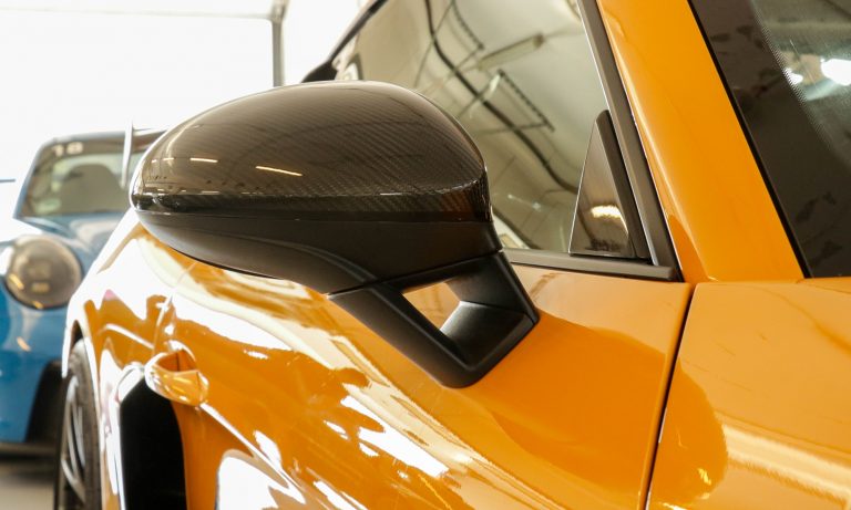 Elég megnézni az első sárvédőket és világossá válik, hogy a GT4 RS egy célgép. A tetején légcsatornák szaggatják szét, a magnézium felnik mögött pedig szűkebbre varrták, hogy optimális legyen a légáram. Az oldalablakai mögött szénszálas légcsatorna van, így szolgálja ki a motor megnövekedett levegő igényét és ráadásként az isteni szívászaj is a fül mellett hallatszik. 35 kg-mal könnyebb a GT4-nél az RS, de a Weissach csomaggal még néhány szénszálas elem és magnézium bukócső kerül az autóba.