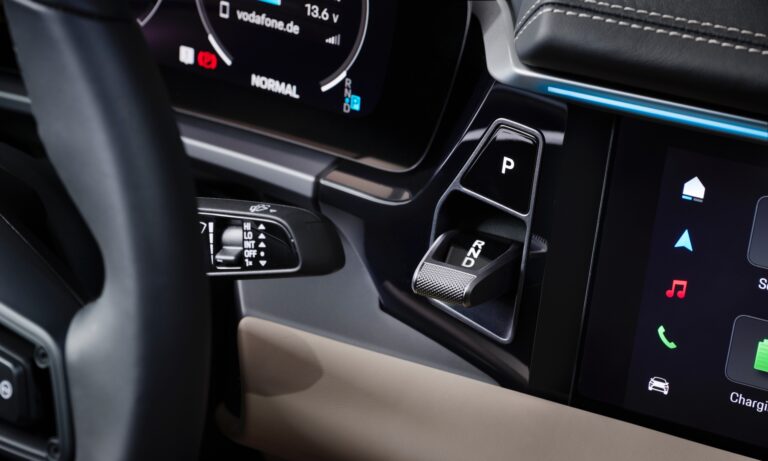 Háromküllős sportkormánya mögött hajlított kijelzőn jelenik meg a műszeregység, a középkonzolon pedig egy 10,9 colos érintőképernyőről vezérelhető a legtöbb funkció. A szellőzőnyílások alatt azért még maradt néhány gomb, hogy a klíma könnyen kezelhető legyen. Opcionális a szintén 10,9 colos érintőkijelzője, mely speciális bevonata miatt nem látható a vezetői pozícióból. Ezen a navigáció képe és a szórakoztatórendszer mellett videót is lehet nézni. Lesz mivel szórakozni a töltőn lógva is, nem kell unottan tespedni a vegán bőrrel kárpitozott ülésekben.