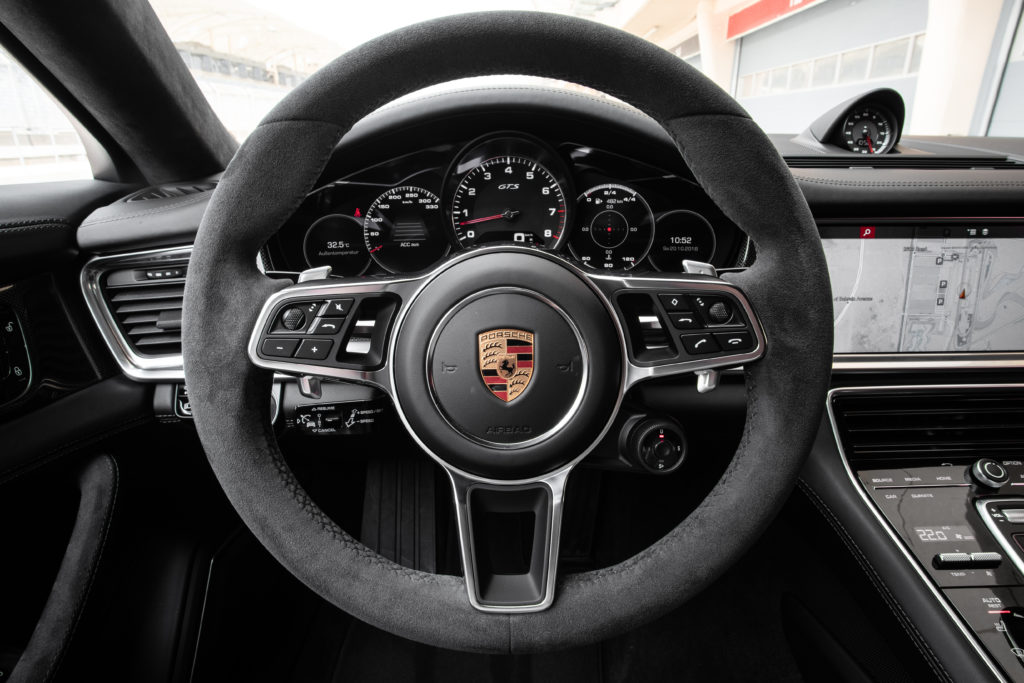 A GTS annak ellenére, hogy nem pályagépnek építették, meglehetősen feszes (és nemcsak a szedán, hanem a Sport Turismo is, természetesen), pláne Sport+ módban. Abszolút reális kihívás vele a kanyarvadászat (pláne úgy, hogy a hátsó kerekek is rásegítenek a fordulásra), nyilván nem olyan feszes, mint a pályán felvezető autóként előttünk krúzoló 911-es, de egy ötméteres sportszedánhoz képest teljesen. Virtuális lőtávon belül volt pályán a kifejezetten versenykörülményekre kihegyezett BMW M5-höz képest, amit nem gondoltam volna, hogy őszinte legyek.