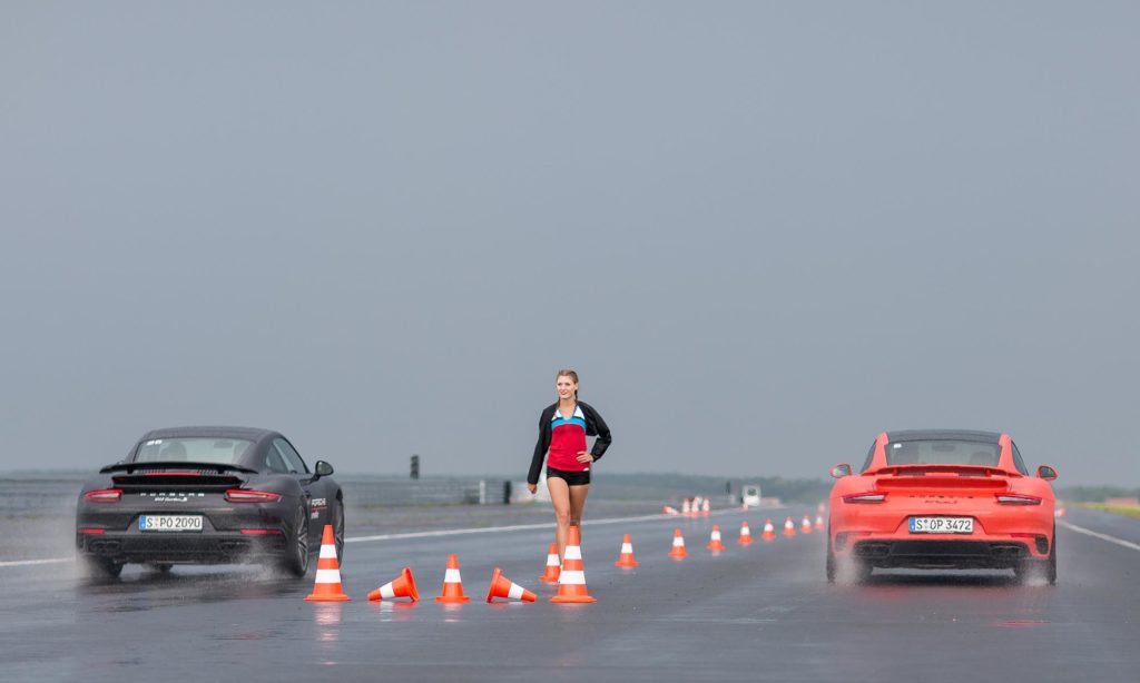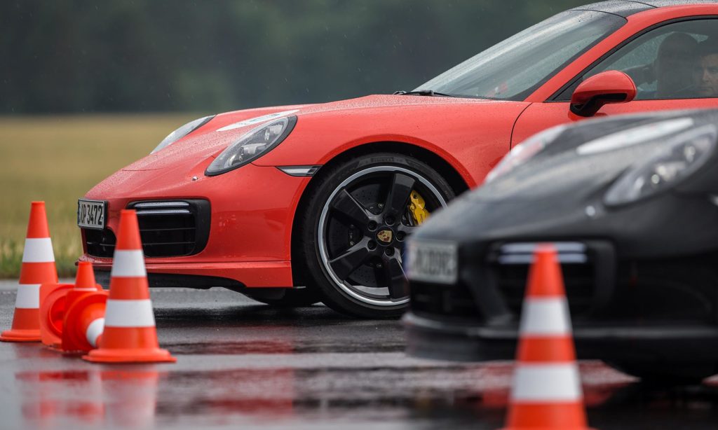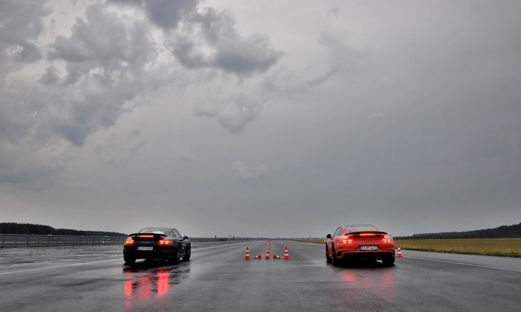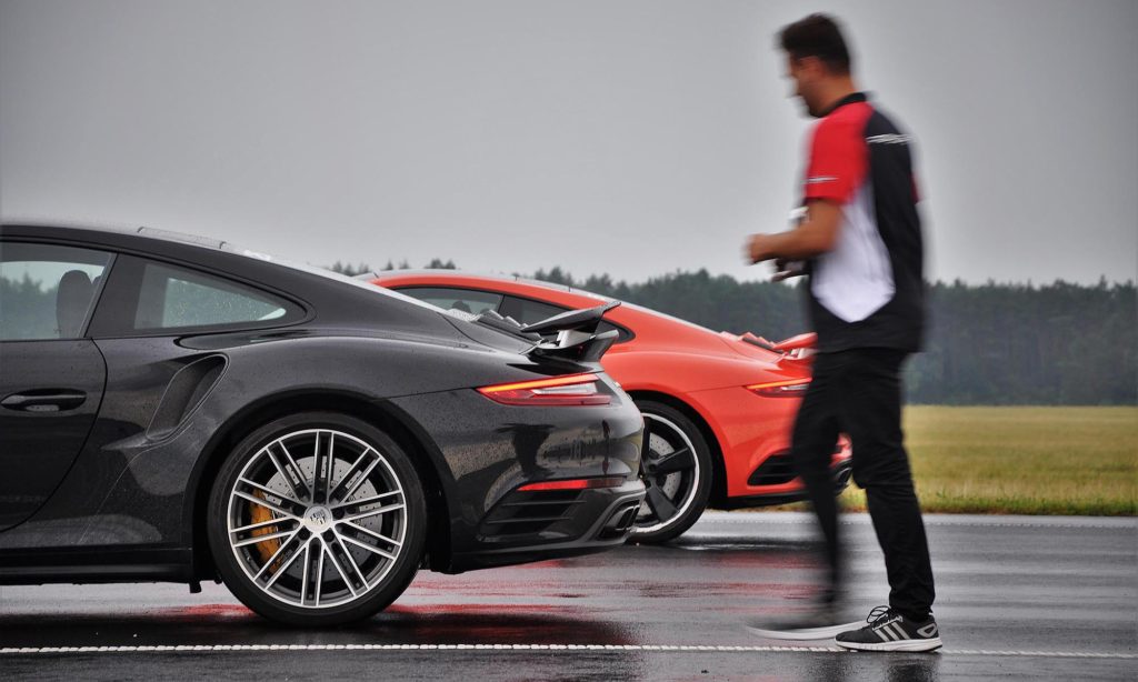 A két 911 Turbo S már izgalmasabb feladat elé állított. Gyorsultunk, és talán azt hinnéd, hogy a gázt mindenki tudja nyomni, de a megállás is része volt a játéknak, méghozzá egy előre kijelölt helyen.