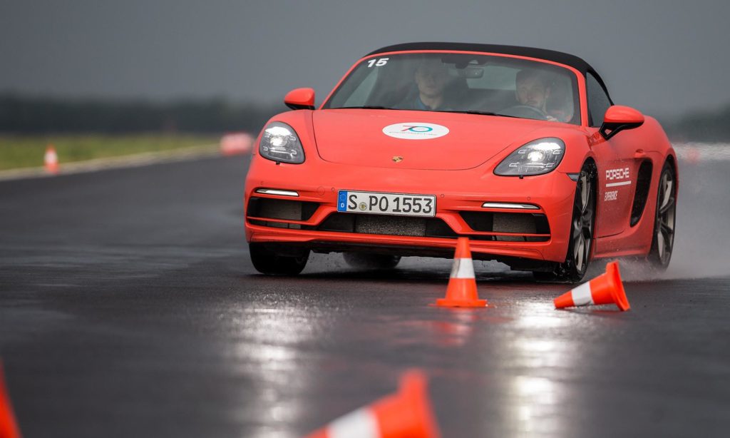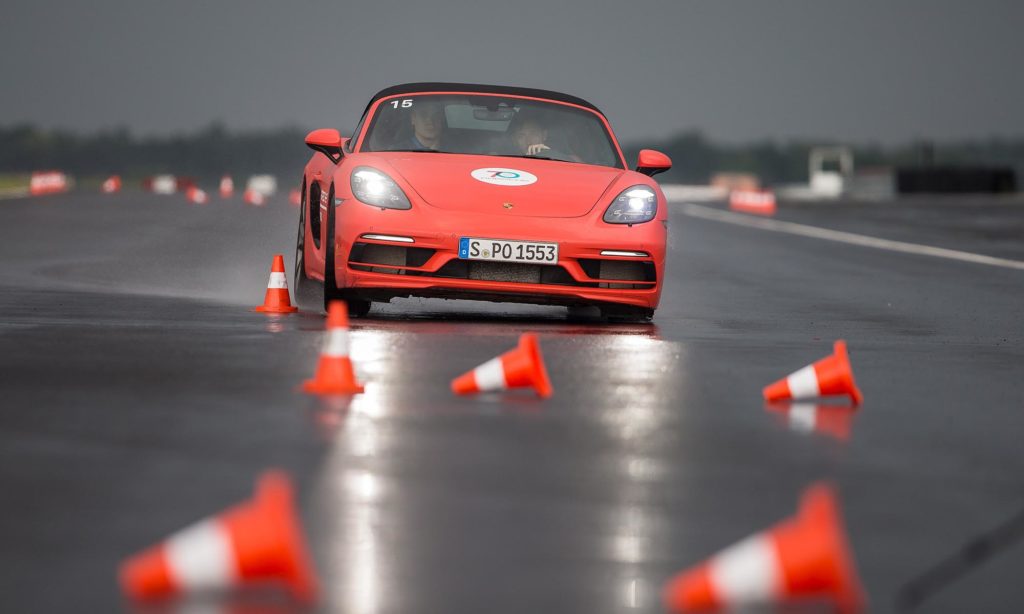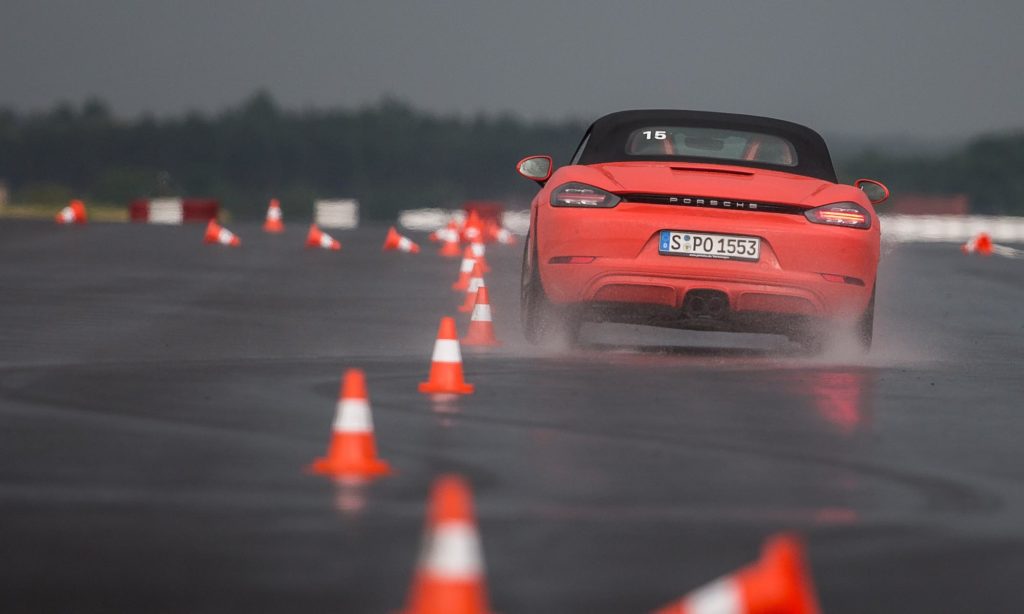 A kifutópályán azonban a szakadó esőben is szabad volt a játék, ahol egy pár 718 Boxster S és 911 Turbo S várt ránk. A kisebbik Porschével a szlalomot kellett teljesíteni, ami a vizes pálya ellenére is gyerekjáték volt, a kormányon lévő forgókapcsolót Sport+ módba állítva még a PDK váltó automata módjában is kezesen és gyorsan kerülgette a bójákat. Még az sem fogott ki rajtunk, hogy utána a pályát hátrafelé, tolatva is teljesíteni kellett.