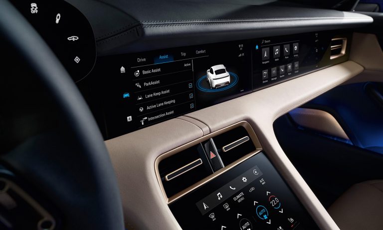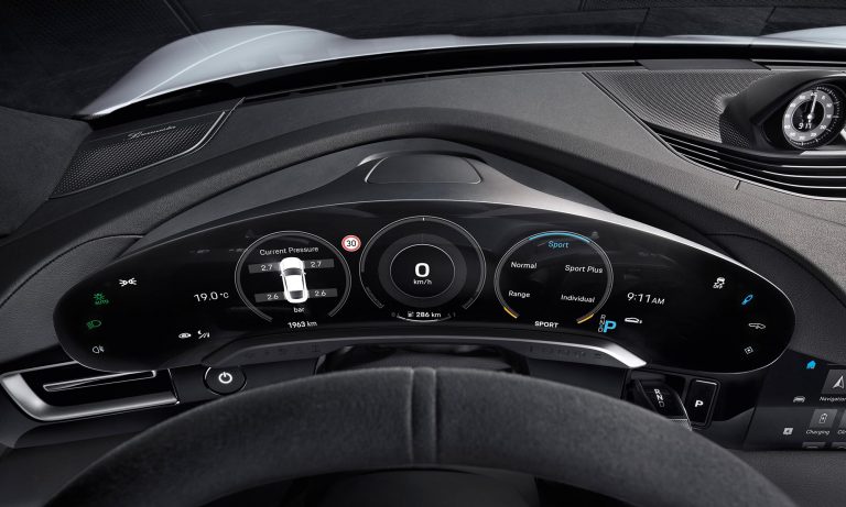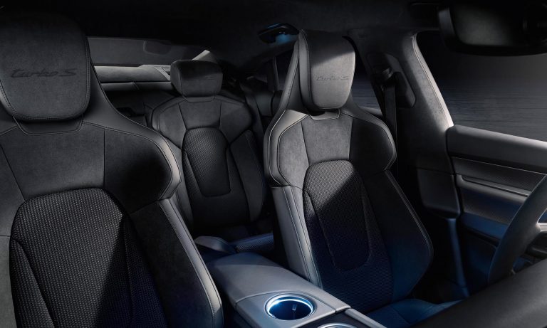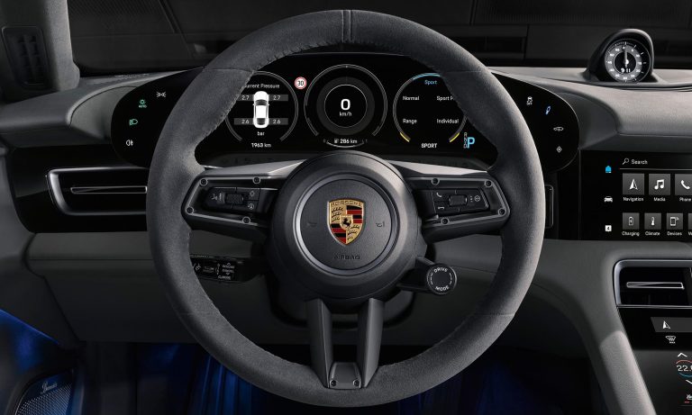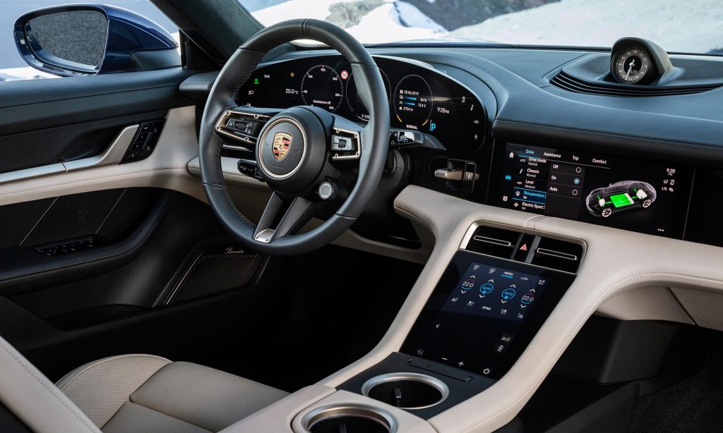 A középkonzolra 10,9 colos érintőképernyő került, alatta egy másik kijelzőn lehet állítani a klímát, és még az utas is kapott egy képernyőt maga elé. A csomagtér mérete nem kiemelkedő, 366 literes, de az orrában is van egy 81 literes rekesz, és később Cross Turismo néven kombiként is jön a Taycan.