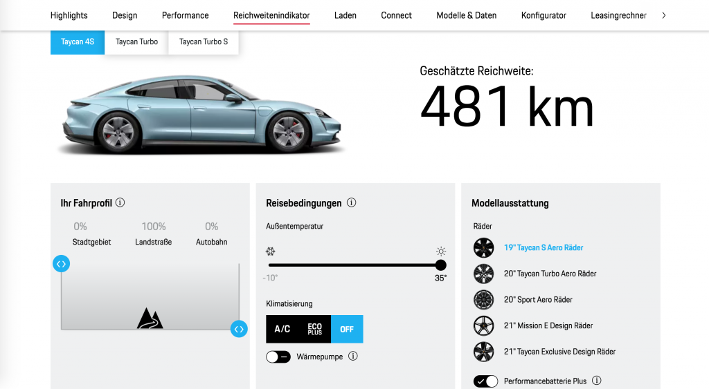 Nagyon előremutató és még inkább bizalmat gerjesztő, hogy a Porsche oldalán egészen precízen össze tudjuk kombinálni magunknak a felhasználási szokásoknak megfelelően, hogy mennyit is fog tudni az akksi. Érdemes kipróbálni, csak úgy simán is szórakoztató játék. Hiszen, sok mindentől függ a hatótáv: a sebességtől (vagyis, hogy a város, főút, autópálya hogy oszlik meg), használunk-e egyéb berendezéseket, mint például a légkondi, mekkora a külső hőmérséklet (minél nagyobb, annál jobb az akksinak), mekkora kerekeken gurulunk.