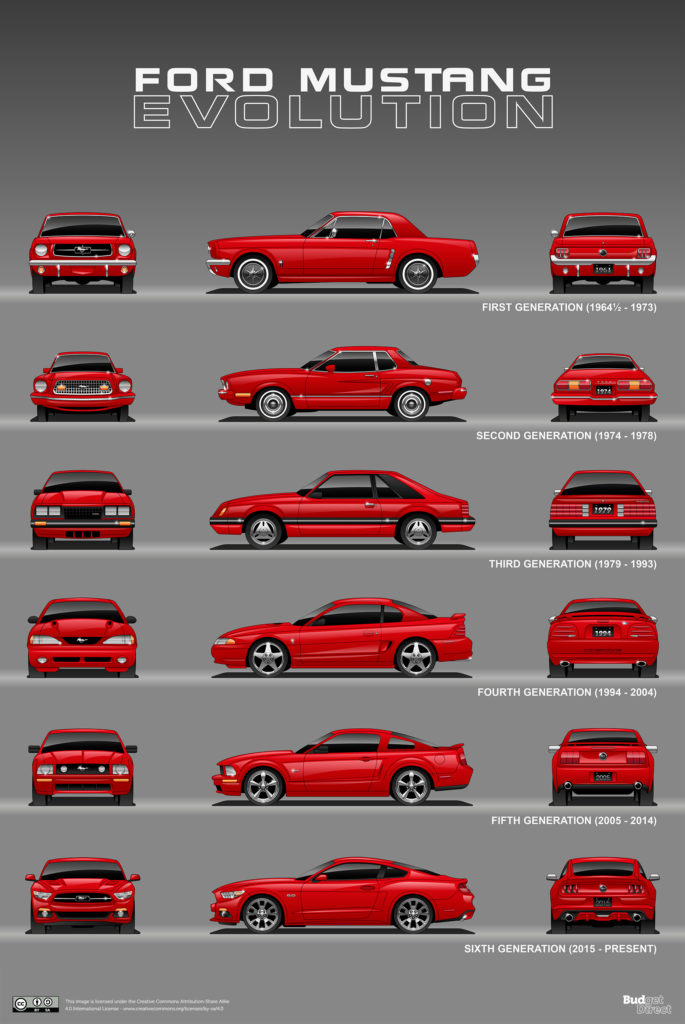 Az első széria igazi ikon, de a Mustangnak voltak kevésbé sikeres generációi is, az 1974-ben bemutatott második szériának már takarékosabbnak és biztonságosabbnak kellett lennie, ezért kisebb és nehezebb lett, még négyhengeres motorral is árulták. Az 1979-től gyártott harmadik szériát sem fogják a legjobban sikerült formatervek közt emlegetni.