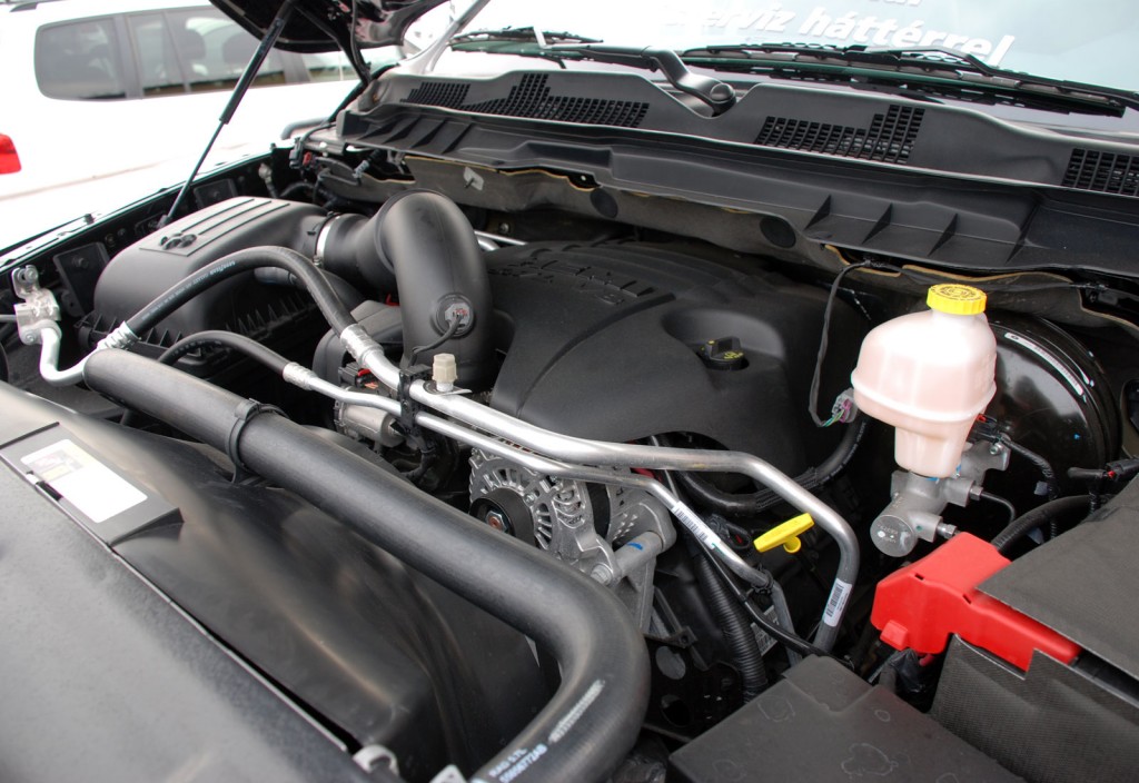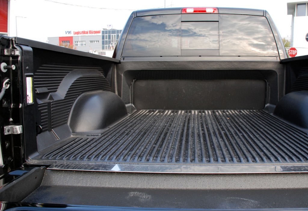 A V8-as hangja nem tolakodó, de azért megteszi a hatását a női nemre is. Aki pedig nem olyan lány, az is nyugodtan beszállhat az anyósülésre, mert az kartávolságnál messzebb helyezkedik el a vezetőüléstől. A belső pedig bár baltával faragott, de utólag legalább lecsiszolták, kényelemben és szolgáltatásaiban pedig hozza a prémium személyautók szintjét – jó, azokban nincs elektromosan elcsúsztatható ablak az utastér és a plató között.