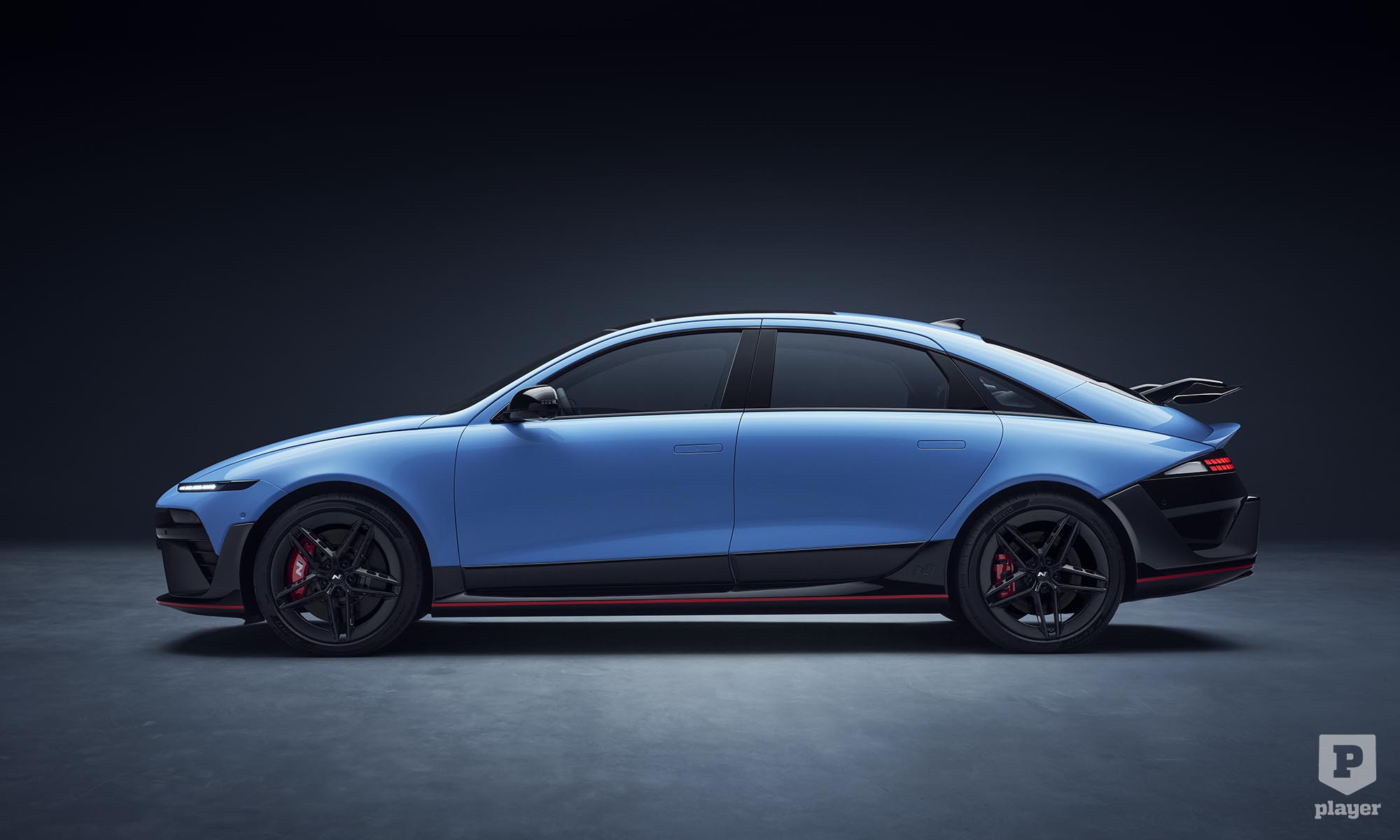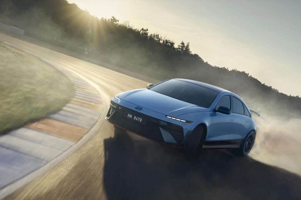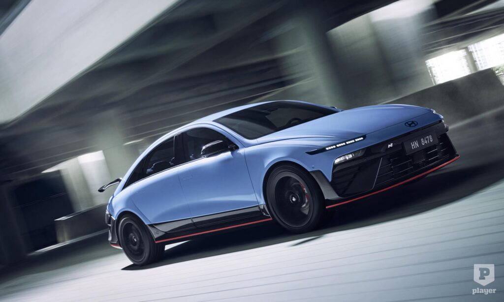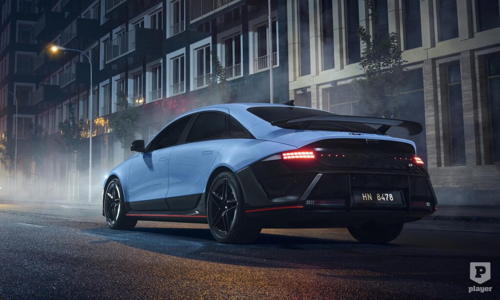 A lökhárítókat átszabták, a féknyergek pirosak, és egész messziről fel lehet ismerni a hatalmas légterelő szárnyáról. A hajtáslánca az Ioniq 5 N-ből ismerős, ahhoz hasonlóan egy-egy elektromotor hajtja az első és hátsó kerekeket. A hátsó 383 lóerős, az első 226 lóerőre képes, együttesen 609 lóerősek, de az N Grin Boost móddal 650 lóerőt és 770 Nm-t szabadít fel a hajtás.