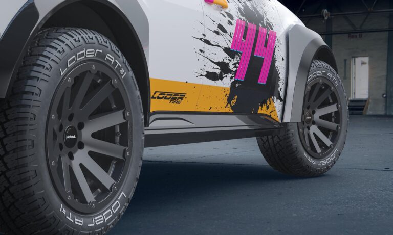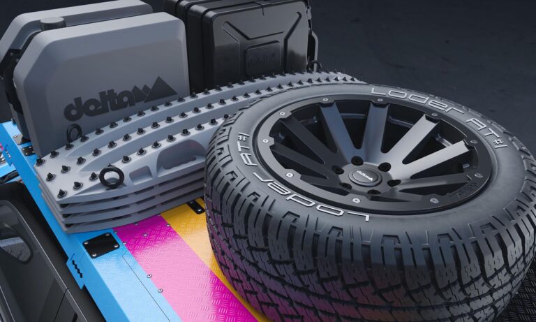 Mindenekelőtt nem kevéssel, tíz centivel megemelték a futóművét, és 18 colos kerekekre vaskos offroad-abroncsokat húztak, ez jutott a pótkerékre is, aminek már csak a tetőcsomagtartón maradt hely. Extra reflektorokat szereltek a tetőre,