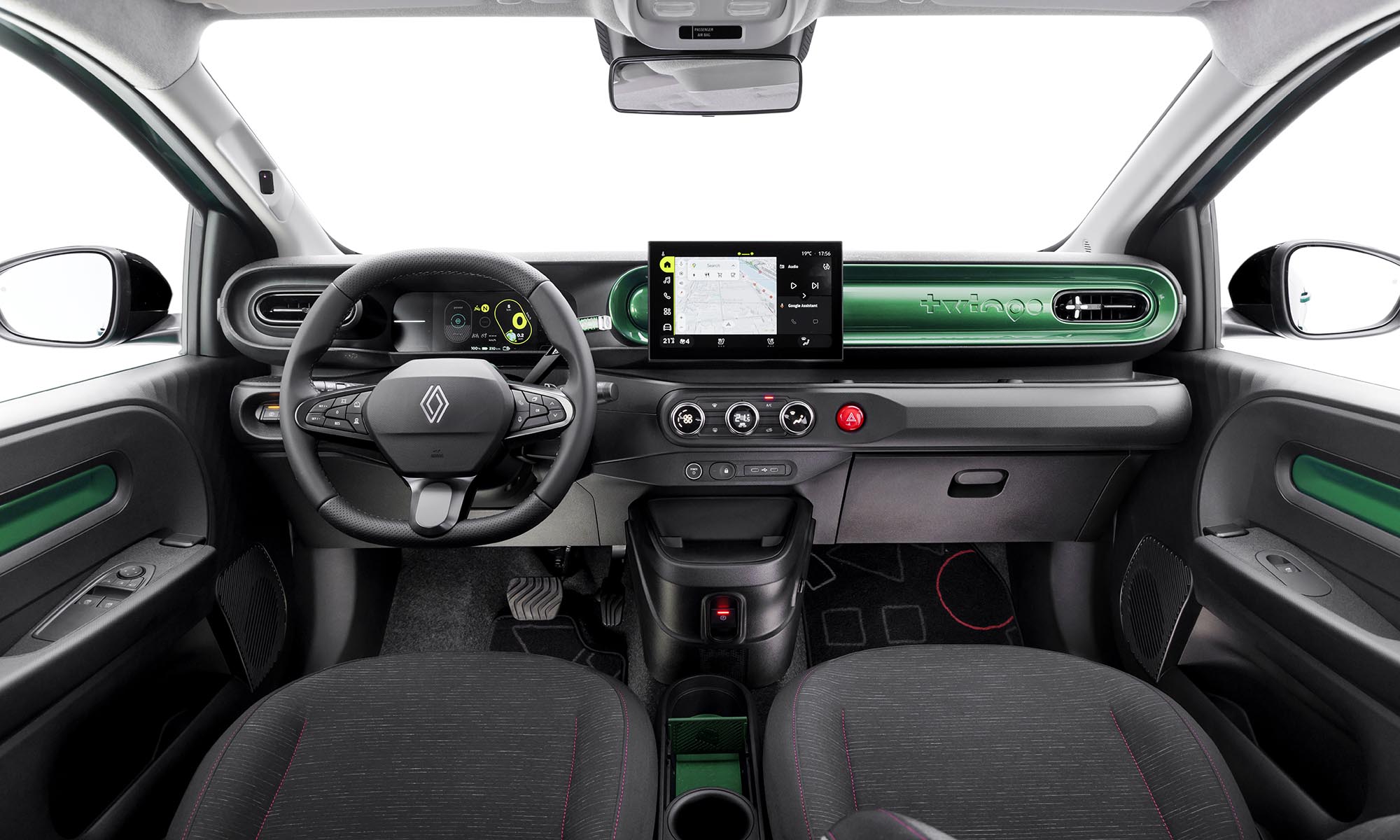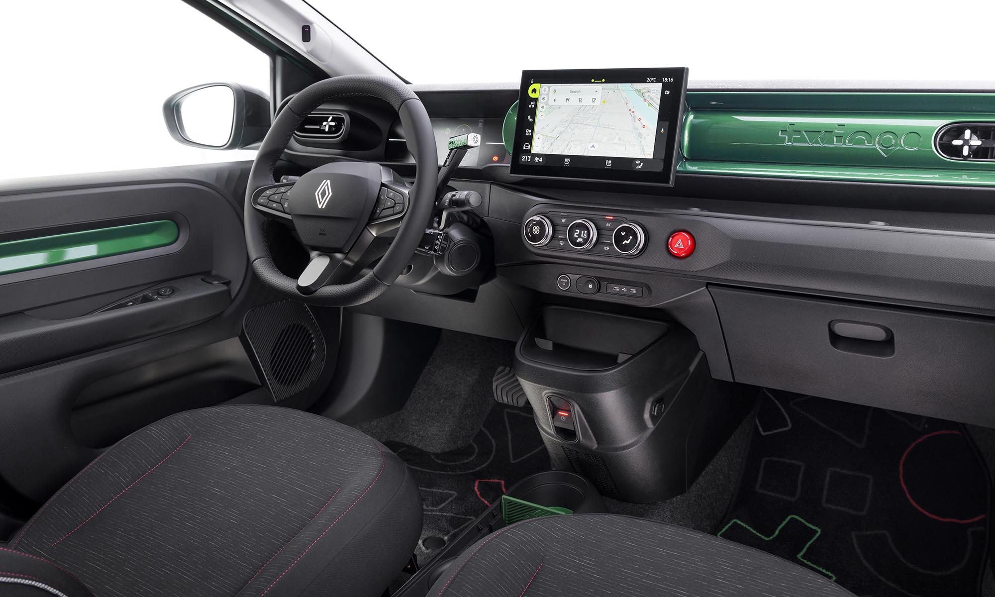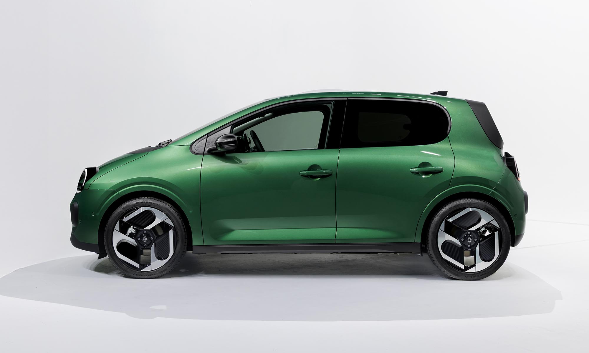 Sajnos az ötletes félkör alakú kilincseknek búcsút kellett inteni, helyette hagyományos darabok kerültek az ajtókra. A kerekek alapból is 16 colosak, csaknem teli dísztárcsákkal, a jobban felszerelt változatok pedig dizájnos 18 colos alufelniket kapnak, és ekkora kerekek még a korábbi Twingo RS-en sem voltak. Mint az eredetin, úgy ezúttal is