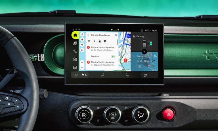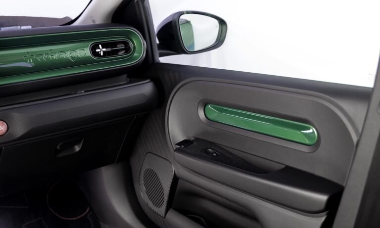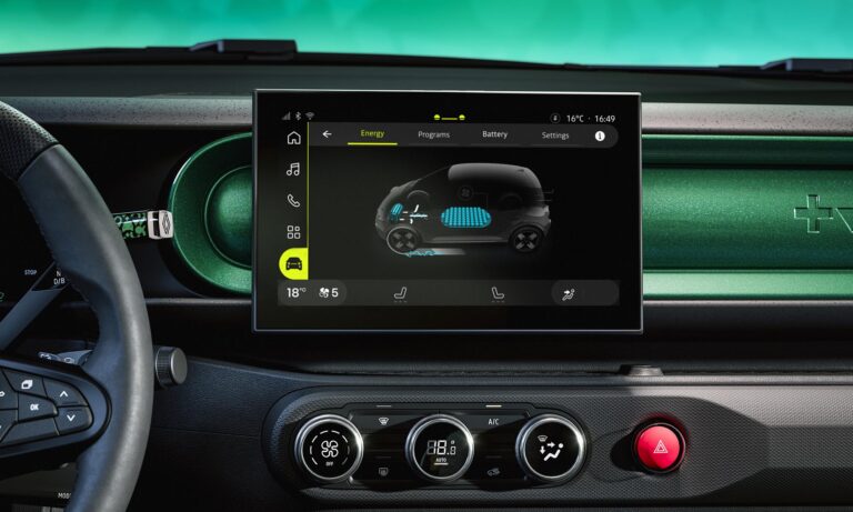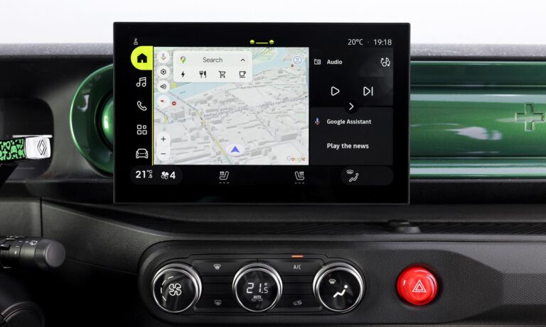 Belül már kevésbé retró, csak a vészvillogó nagy piros gombja idézi az elődöt, de a dizájn így is tele van játékos színekkel és formákkal. Alapáron jár a 7 colos műszeregység és a 10 colos érintőképernyő, amin a Google-alapú fedélzeti rendszer fut, Google Térképpel és letölthető alkalmazásokkal. A minőségérzetet is jónak ígérik, egyedül a nem lehúzható, hanem kibillenthető hátsó ablakon érezni a spórolást, ez egyszerűen így adta ki.