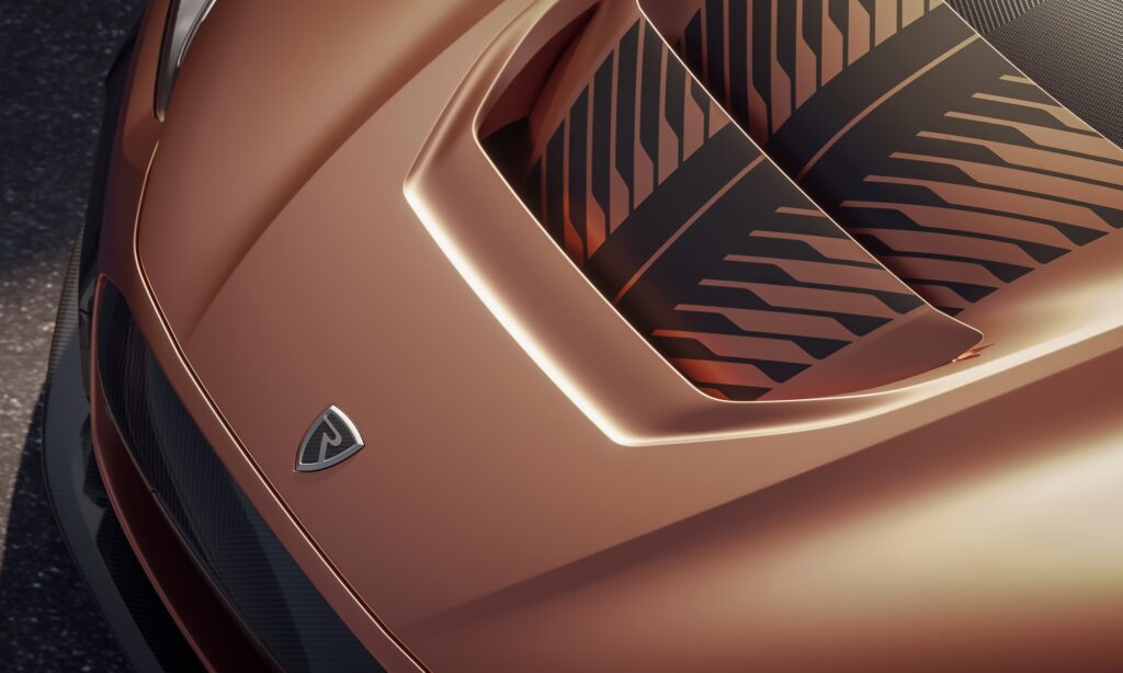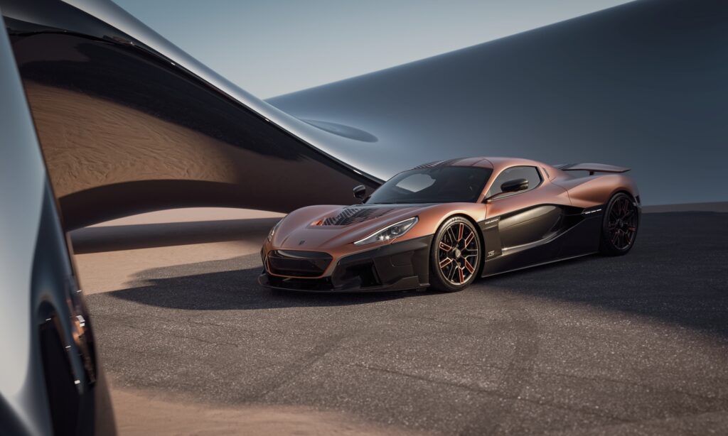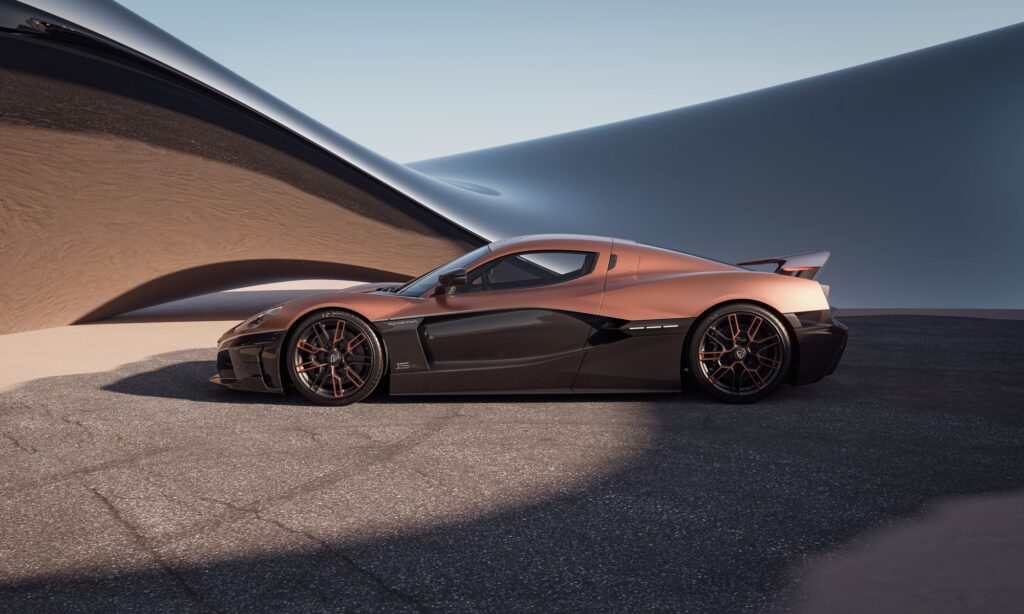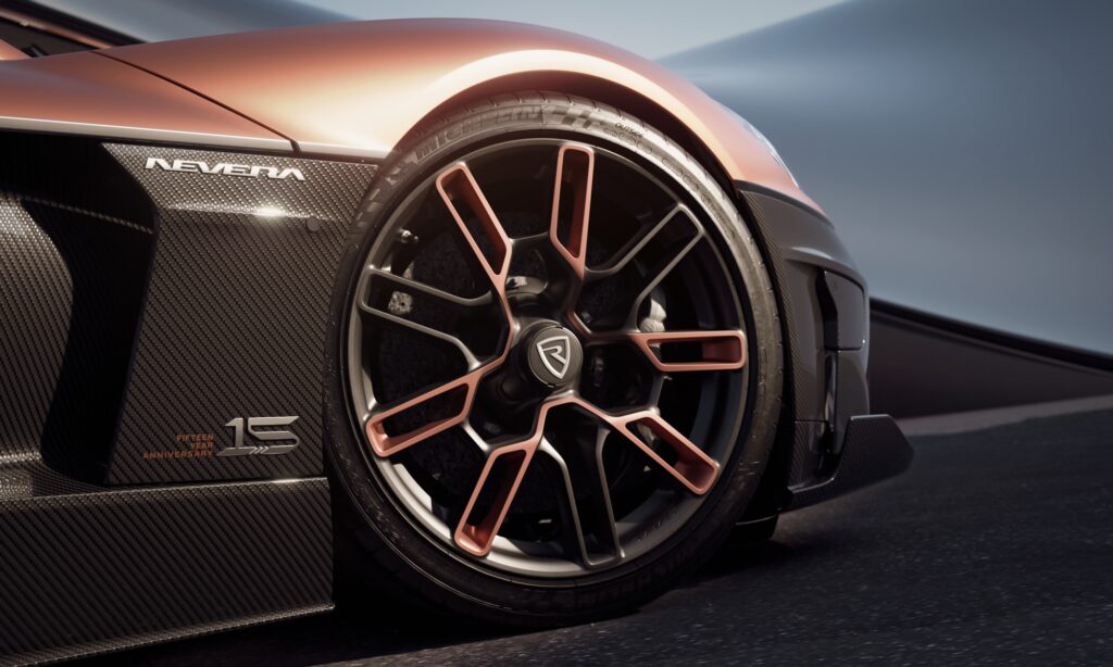 Rézszínű fényezése matt lakkozású, az autó alsó részén pedig szabadon látható a karbon mintázat. Hiszen a Rimac Nevera javarészt szénszál erősítésű műanyagból készül, hogy a lehető legkönnyebb legyen a négy villanymotor és a 120 kWh kapacitású akkumulátor ellenére. A kilenc darabos limitált szériában gyártott 15th Anniversary Edition kétszínű felniket és nyomtatott áramkörökre utaló matricákat visel.