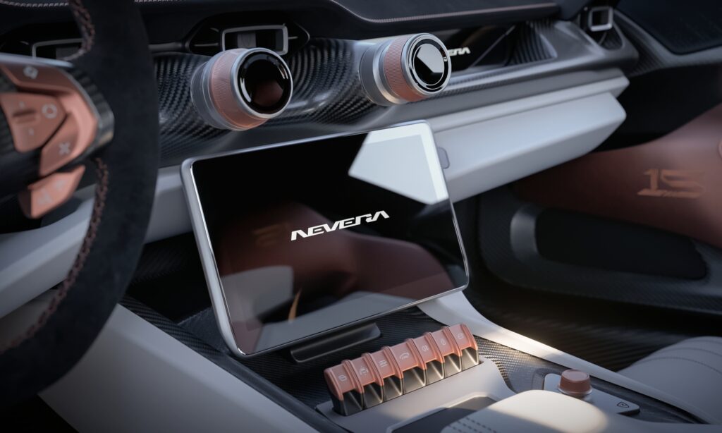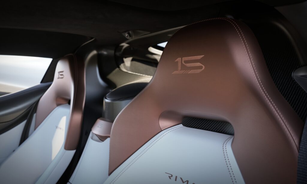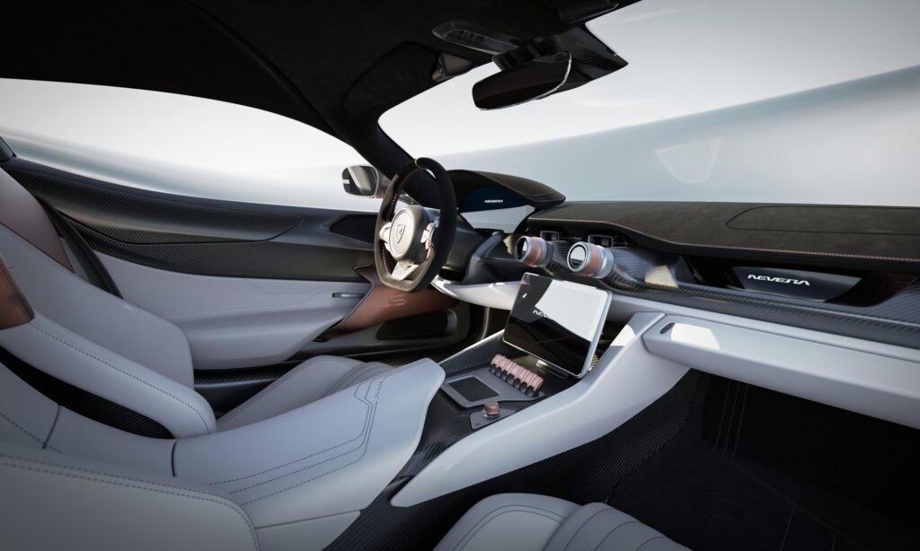 Hófehér bőrkárpittal és fényezéshez passzoló réz kiegészítőkkel a Nevera 15th Anniversary Edition utastere extravagáns.