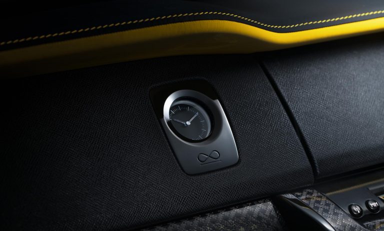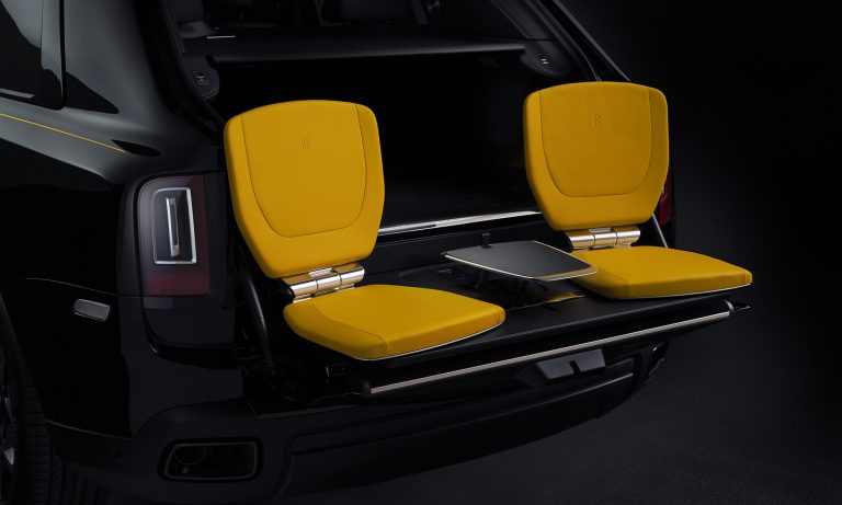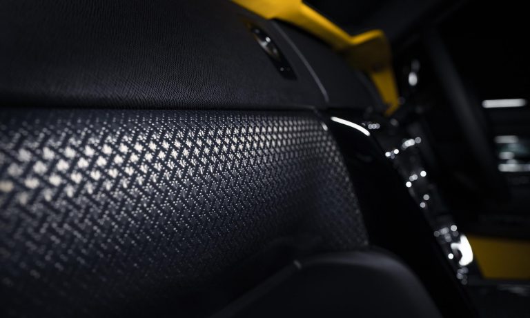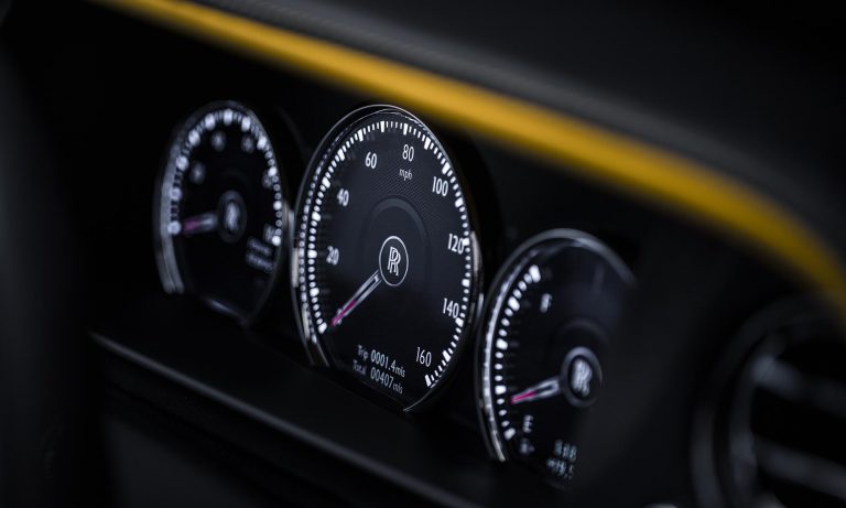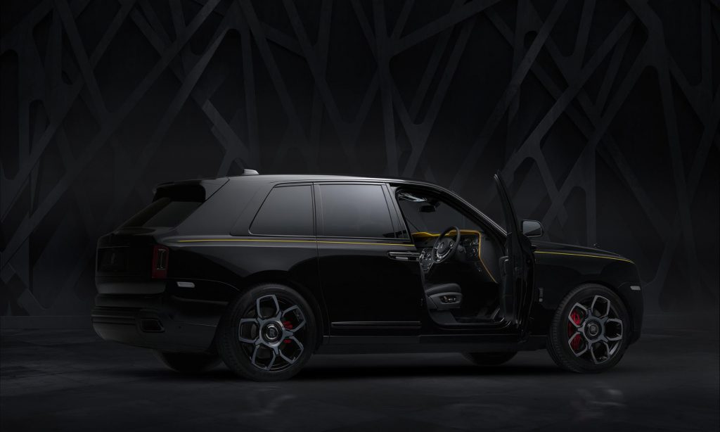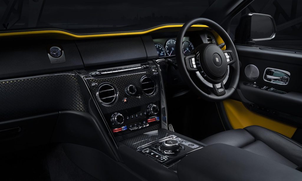 A jellegzetes hűtőmaszk és az ablakkeretek krómozását is sötétítették, még a Spirit of Ecstasy szobrocska is ebben az árnyalatban pompázik. A kerekek 22 colosak, mögöttük piros féknyergekkel, és a belső térben is a fekete szín dominál, de a karosszériát díszítő sárga szín belül is visszaköszön.