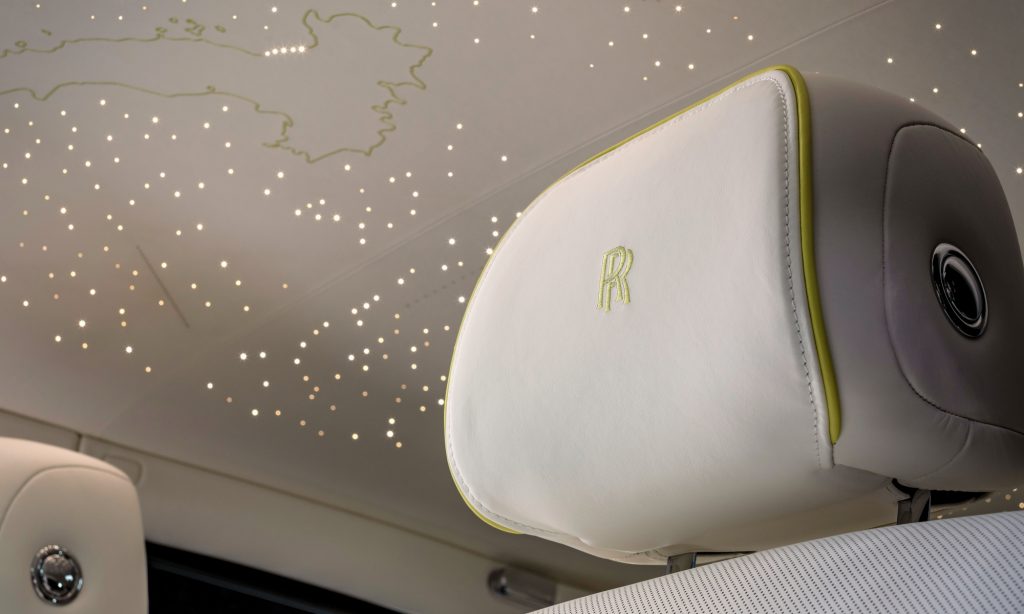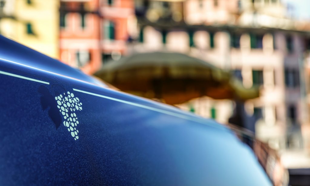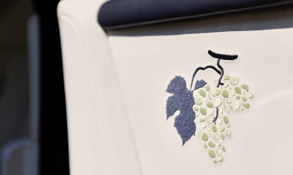 9215 öltéssel varrták fel az ajtókárpitokra a szőlőfürtöt, a karosszéria sötétkékre fényezett vásznára pedig kézzel festették.