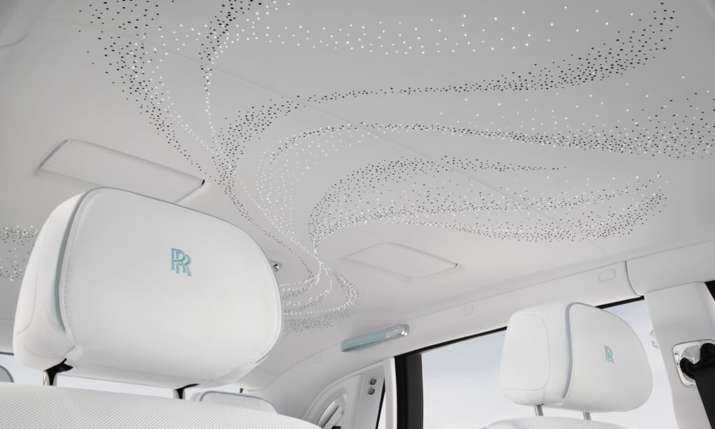 Elmaradhatatlan a Rolls-Royce csillagos eget idéző tetőkárpitja, melyhez 1500 optikai szálat és 4450 performációt készítettek. A műszerfal galériájára pedig tömör alumíniumból mart szálakból fűztek könnyű textilre emlékeztető mintát, hogy a Phantom minden pontján visszaköszönjön az extázis szelleme.