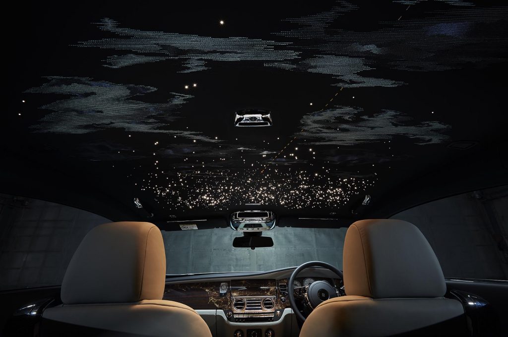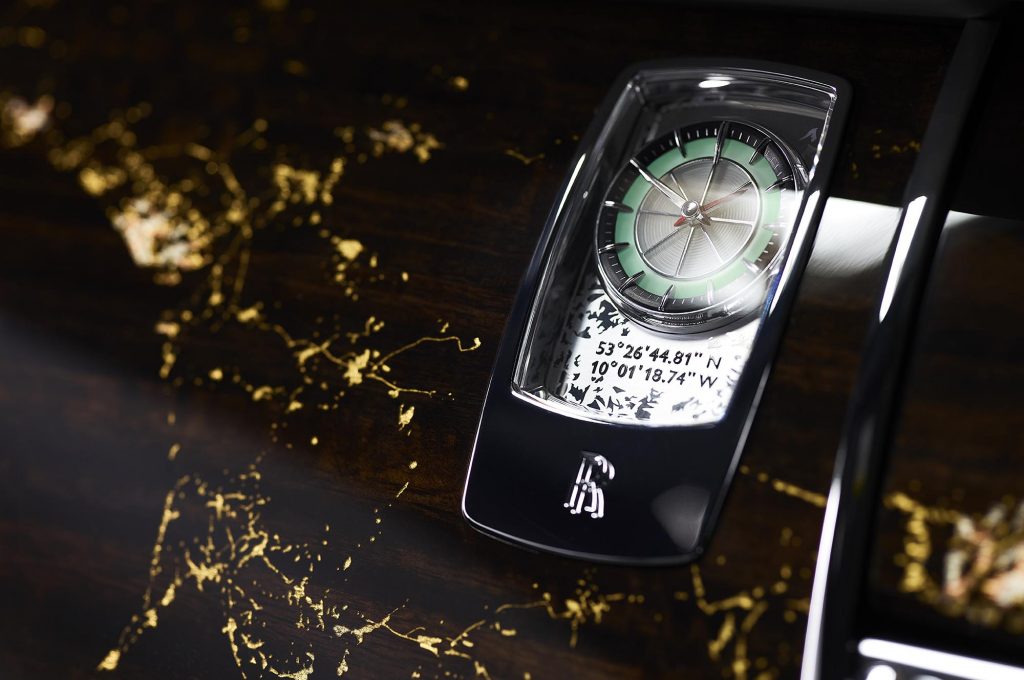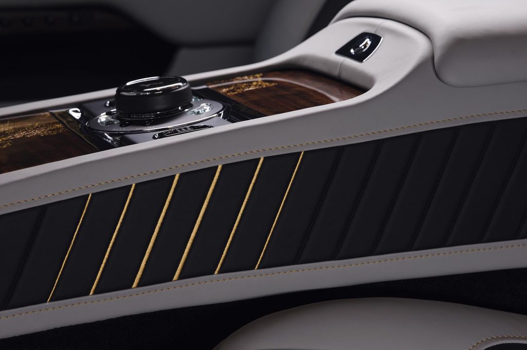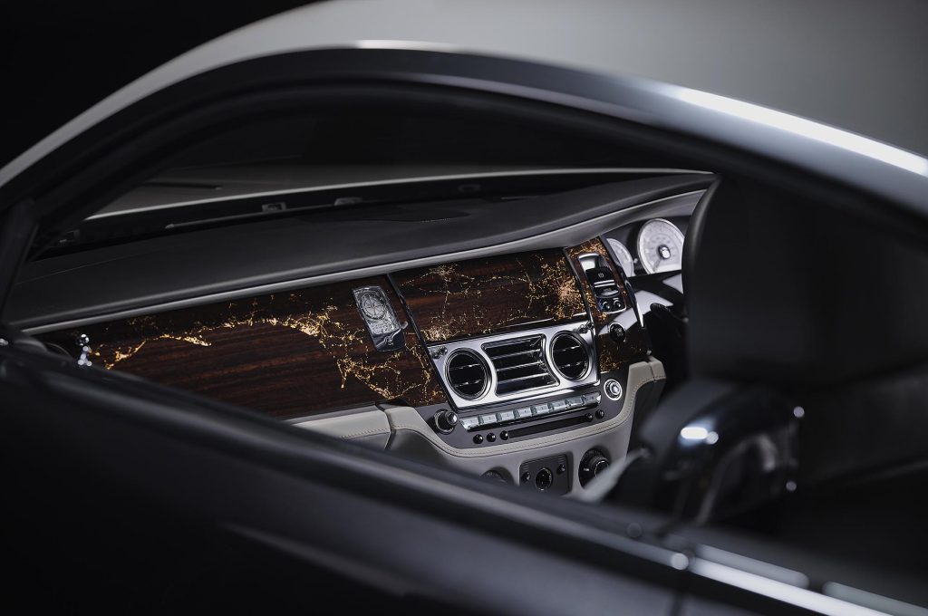 a műszerfal eukaliptusz fabetétjére arannyal futtatták fel azt a mintát, amihez hasonlót az éjjel repülők látnak az alattuk lévő kivilágított városokból.
