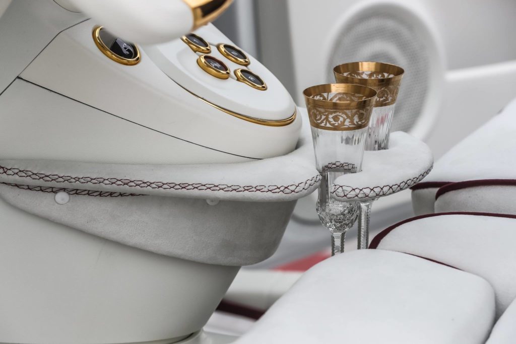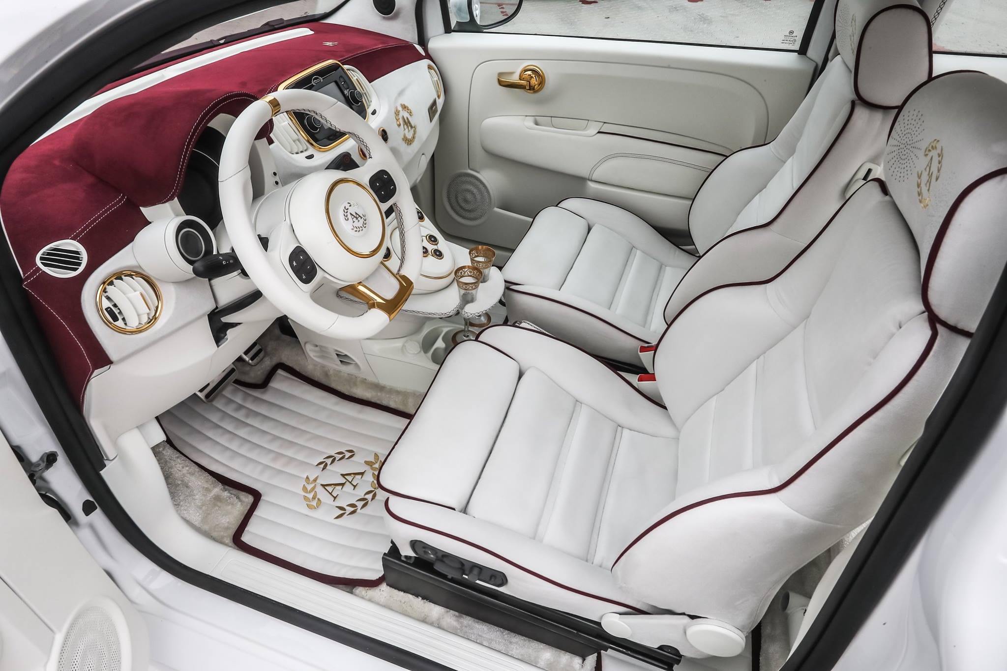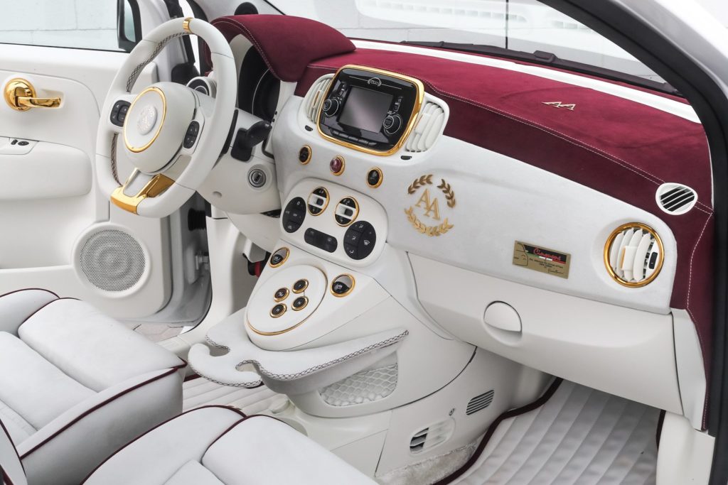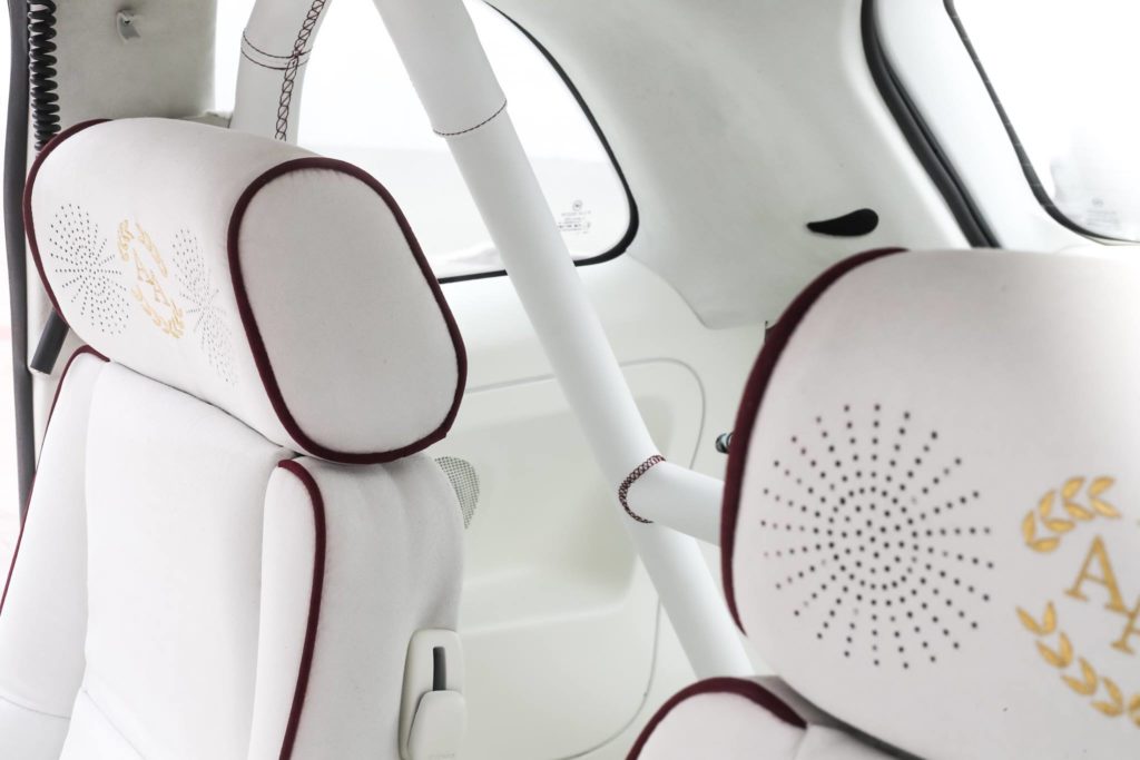 Mindent, amit csak lehetett, fehérre színeztek, a műszerfal felső részét bordó hasított bőrrel vonták be, és az aranyszínű díszítéseket sem spórolták el. Fehérek a bőrülések is, a hátsó ülések helyére szerelt bukócsövet is bőrrel vonták be, és a bukósisakoknak is külön helye van. A giccs határát súroló műszerfal aljára még pezsgőspohár-tartó is került.