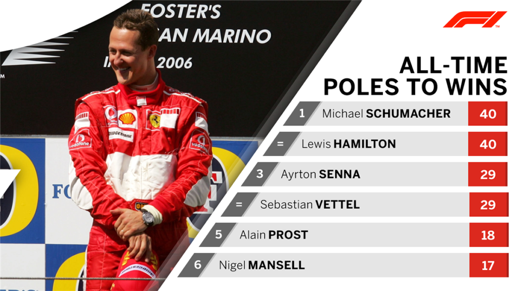 Nem kis teljesítmény az időmérőt és a futamot is tökéletesen lehozni, vagyis megszerezni a pole-pozíciót és megnyerni a versenyt. Természetesen ebben a tekintetben (is) Michael Schumacher a legjobb, igaz, holtversenyben Hamiltonnal (40-40), míg a második helyen Ayrton Senna és Vettel áll (29-29).
