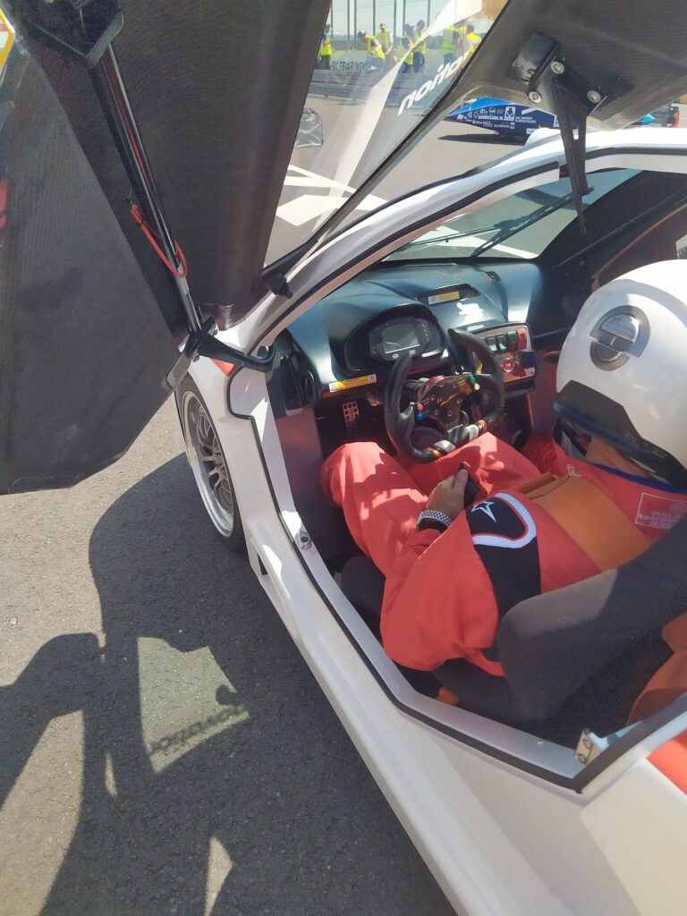 És volt még egy autó, amit nem vezettünk, csak beültünk mitfahrernek. Ezzel a golfkocsira hasonlító járgánnyal – aminek Nagy-Britanniában van közúti engedélye, és az első tesztútján a sofőr elment vele egy gyorsétterembe – a pályán, verseny közben mentünk végig, kerülgetve egymást a mezőny tagjaival.
