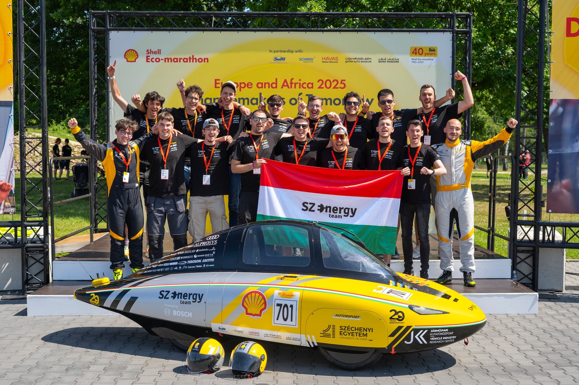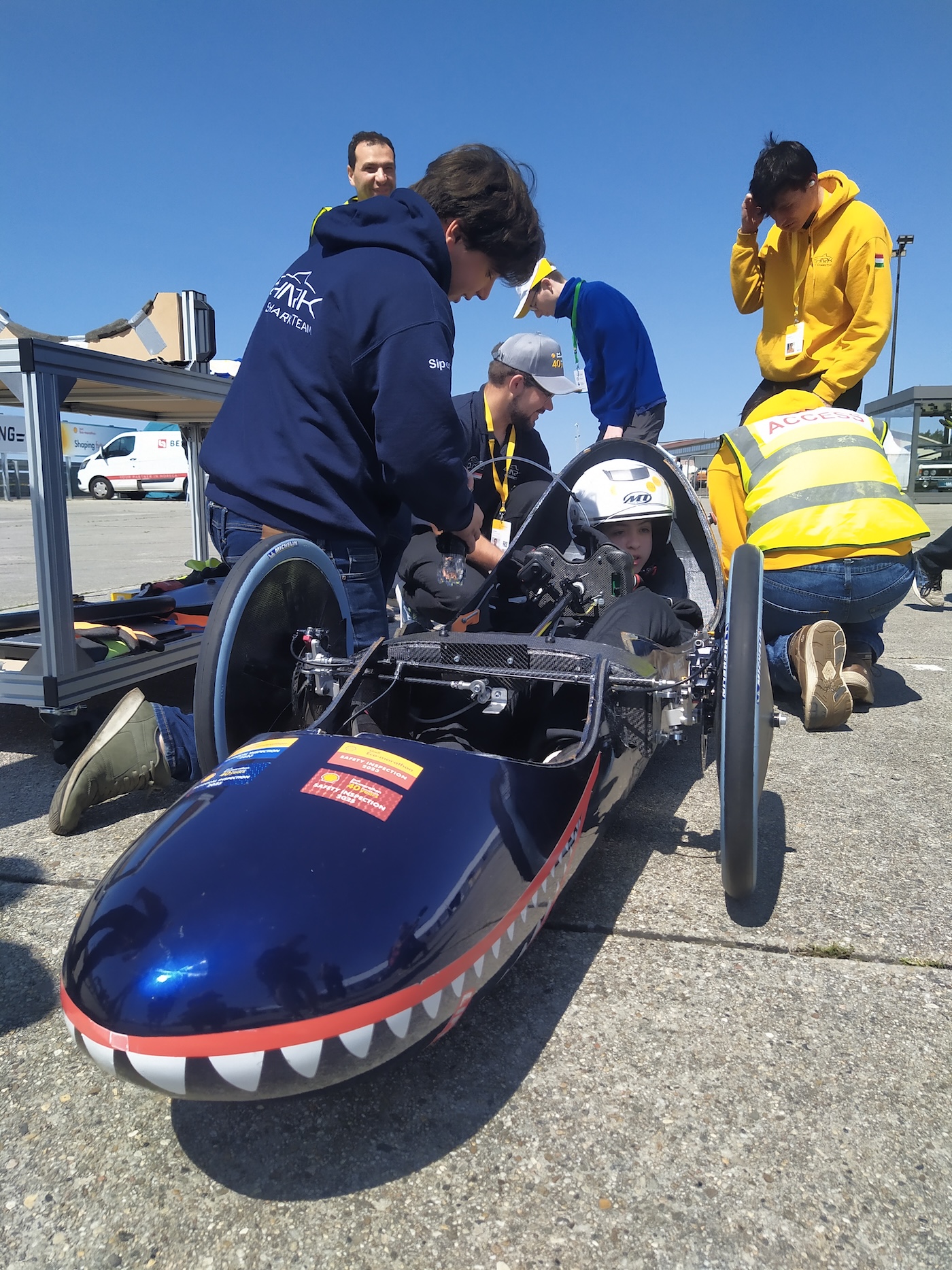 És ebben a versenyben magyar csapatok is szerepelnek, méghozzá eredményesen. Idén két egyetem, a BME és a Széchenyi Egyetem csapatai indultak. A BME Shark Team három csapattal, mindegyikben 15 fő nevezhető, így 45-en érkeztek a helyszínre, de a hétköznapokban 70-80 ember dolgozik a járműveik fejlesztésén.