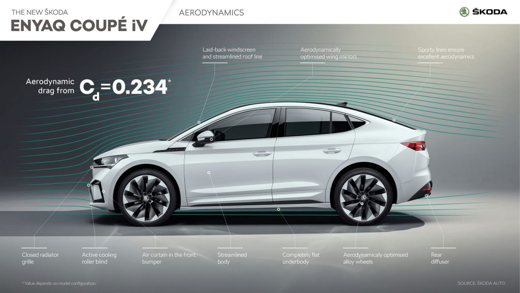 Az Enyaq Coupé két akkuméretben (62 vagy 82 kWh, nettó 58 illetve 77 kWh), három teljesítményszinten (egy motorral, hátsókerék-meghajtással 132 vagy 150, két motorral, összkerékmeghajtással 192 kW) lesz kapható. Az RS csúcsmodell két motorja 220 kW-ot, 300 lóerőt ad le; a kocsi gyorsulása 100 km/h-ra 6,5 másodperc. A gyengébb verziók végsebességét 160, az RS-ét 180 km/h-ban korlátozta a Skoda. A legnagyobb hatótávolságú verzió katalógus szerint akár 545 km-t tehet meg egy feltöltéssel (WLTP szabvány szerint).
