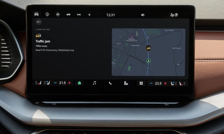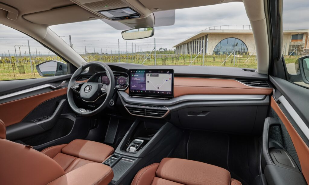 Érdekes kontrasztban van egymással az alapmotoros autó három pedálja és kézi váltója a középkonzol tetején álló 13 colos érintőképernyővel. Ellentétben a nagyobb Superbbel, az Octaviában nincs fizikai kapcsolója a klíma vezérlésnek, hanem nagyjából mindenhez a kijelzőt kell összetaperolni. A modellfrissítés sem oldotta meg azt a problémát, hogy a képernyő alatti kivilágítatlan érintősáv éjszaka továbbra sem látható. Mivel a króm alkatrészek nem csengenek össze a fenntartható életmóddal, ezért az utastérben a kilincsek és a kétküllős kormány tekerőgombjai szaténfényű ezüstre váltottak.