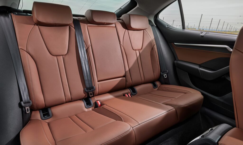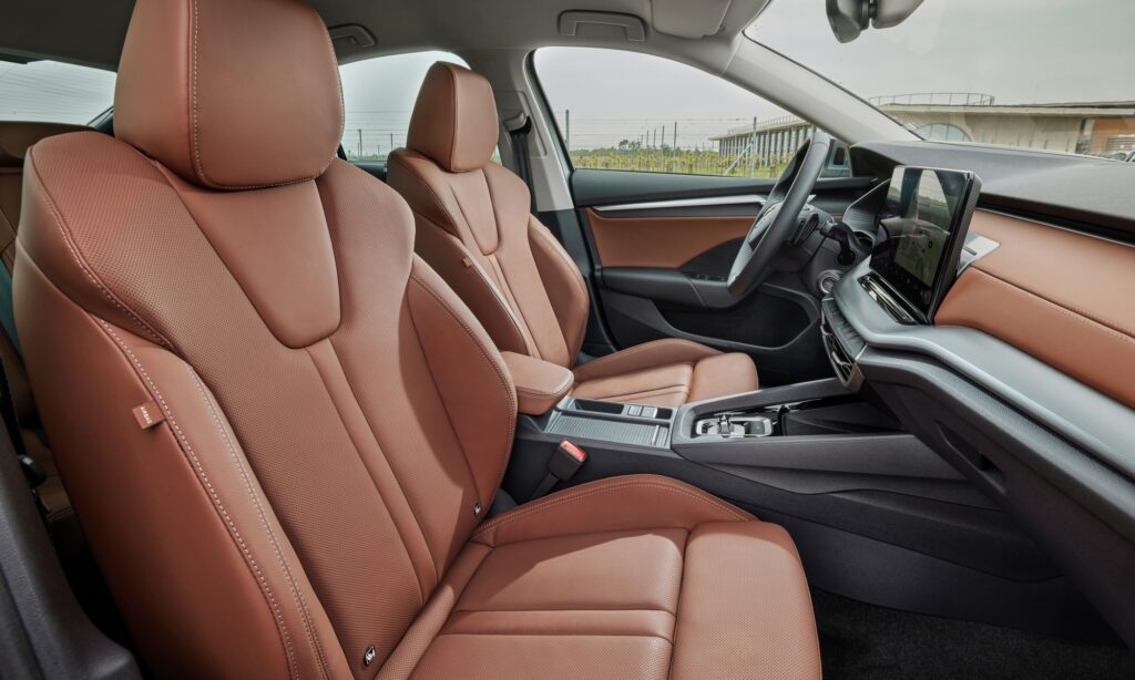 Szövetkárpitokkal és bőrrel is jó hangulatú az utastér, különösen az új konyak színű belső mutat remekül az Octaviában. Ez valódi marhabőrből készül, de a cserzéshez a kávébab héját használják fel. Fenntartható szövetből készült a Sportline fekete és szürke utastere, ami a monokróm színvilág ellenére is otthonos. Nem kell tartani a tengerből kihalászott szemétből és PET palackokból készült anyagtól, hosszú távon is kellemes. A Sportlineban feszesebb oldaltartású ülések vannak, a Selection modellben pedig gerincbarát, AGR tanúsítványosak az ülések.