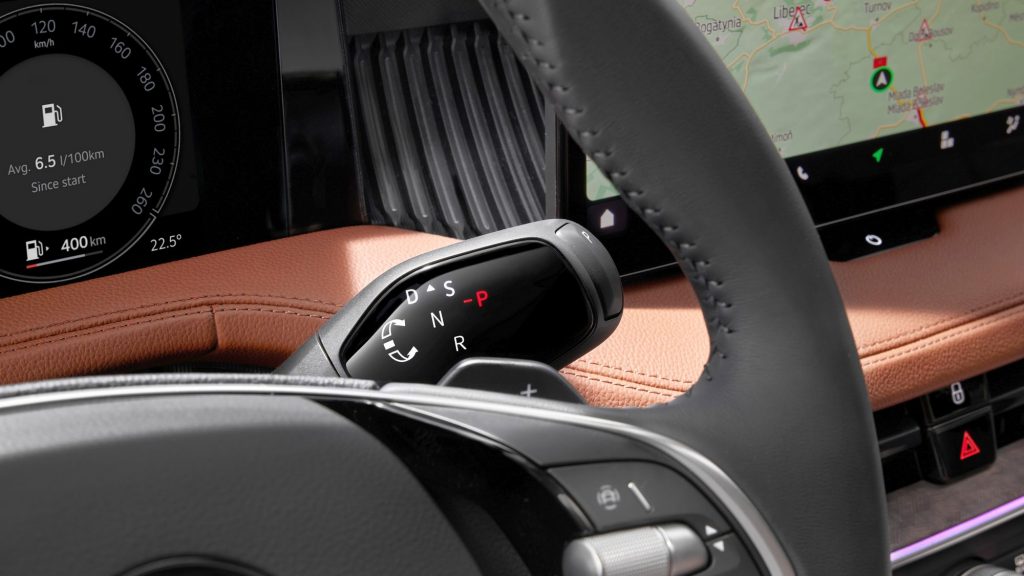 Újdonság: a Merci, vagy ha tetszik, VW ID-módra a kormány mögé emelt irányváltó kar. (És minden Superbben ilyen lesz, mert kézi váltót többé nem lehet kapni ehhez a modellhez.)