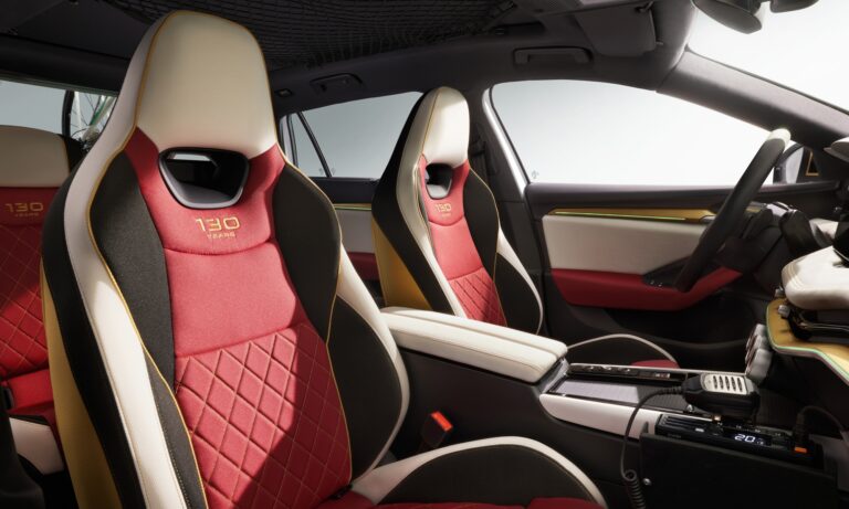 Utasterében a fényezéshez passzoló fehér, piros és arany kárpitozás van, az ülésekbe a 130-as logót hímezték. A műszerfalon a három multifunkciós gomb és a szokásos érintőképernyő mellett egy másik kijelző is van, amin a versenyt lehet követni, valamint CB rádió is van a középen. Az átalakított Superb fedélzetén stabil internetkapcsolat is van, hogy megkönnyítse az adatok áramlását és a kommunikációt a szervezőkkel.
