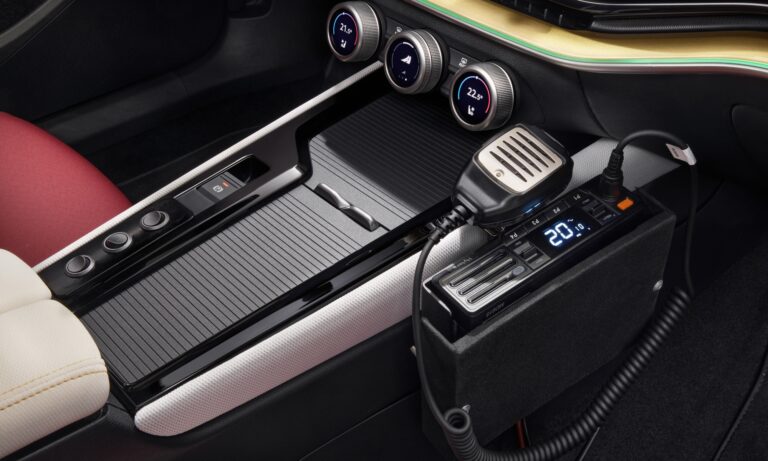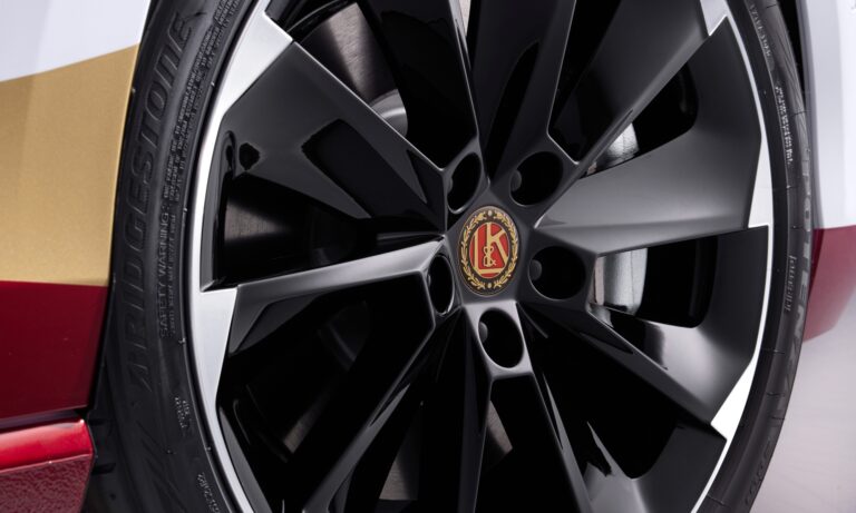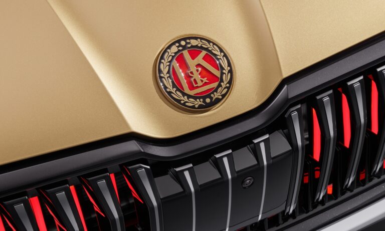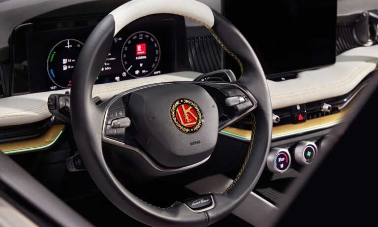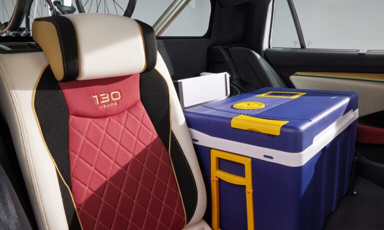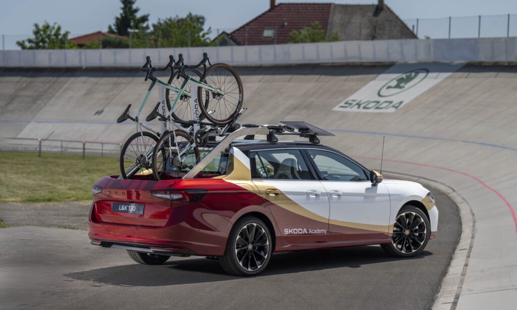 Mélypiros és fehér karosszériáján elegáns arany csík fut végig, a gépháztetőn és a kormányon pedig a régi Laurin & Klement embléma díszeleg. Az autó csomagterét kihúzható platóvá alakították, így könnyebben elérhetőek az a két kerékpár, amit ide lehet rögzíteni. Ezen kívül több tárolóhely van a bringákhoz szükséges kellékeknek. Hátsó ajtaját pedig tolóajtóvá alakították, mert így a nyitott ajtó nem áll a versenyzők útjába.