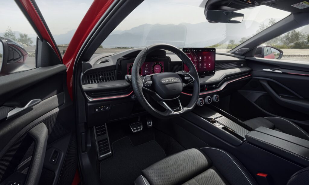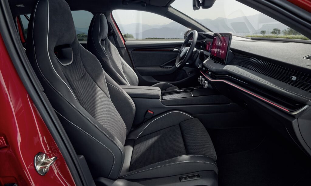 Elsőként a Superb Sportline változatában jelenik meg a Škoda új kormányközepe, ahol már nem a megszokott logó néz szembe a vezetővel, hanem betűk sora. A műszerfalat és az AGR tanusítványos sportülések belső részét mikroszálas anyag borítja, szériában jár hozzá a masszázs, a bőrkárpitos verzióban pedig szellőztethető is. Tagadhatatlanul sportos motívum a fém pedálsor, a karbonminta és a tükröződéseket megelőző fekete tetőkárpit.