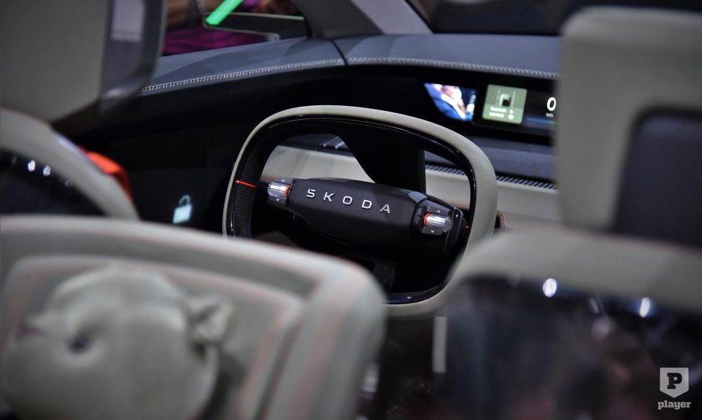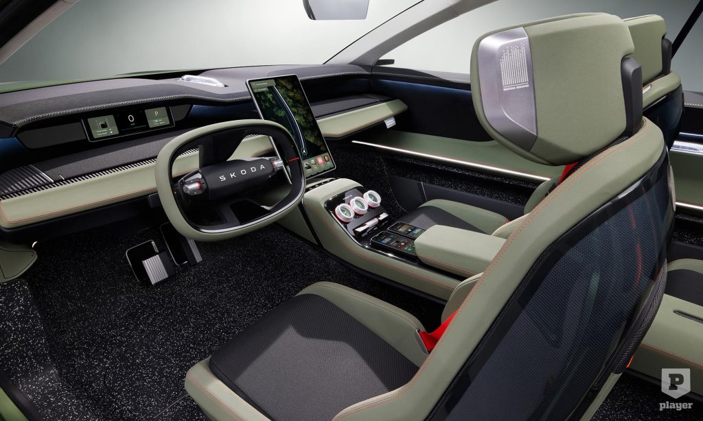 Valószínűleg ez az újszerű beltér-kialakítás már tényleg inkább csak kedves gondolat, mint reális koncepció. A vizuális kijelzőként is működő, sőt: rajzolásra, jegyzetelésre is használható ajtókárpitokról sem gondolnám, hogy utcai Škodába kerülnek majd. Az autó utasterének számos egyéb innovációja viszont teljesen életképes a sorozatgyártás valóságában is.