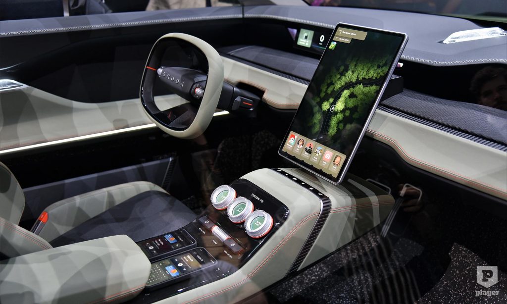 A tanulmányautó információs kijelzői (kormány mögötti 8,8 collos műszeregység, HUD, központi nagy kijelző) egyébként meglepően közel állnak a mai elektromos Volkswagenek vagy az Enyaq már létező valóságához. A Vision 7S elektronikája nem koncepciónak tűnt, hanem a hamarosan érkező új modellek valódi infotainmentjének. A kétküllős kormány már mai Škodákból is ismerős, de a Vision 7S kormányküllőinek változtatható funkciójú gombcsoportjai új dolgok. A Simply Clever okosságok sorát mágneses rögzítésű kiegészítőkkel, mobiltartókkal, táskákkal, miegyebekkel bővítette ki a gyártó a koncepcióautóban.