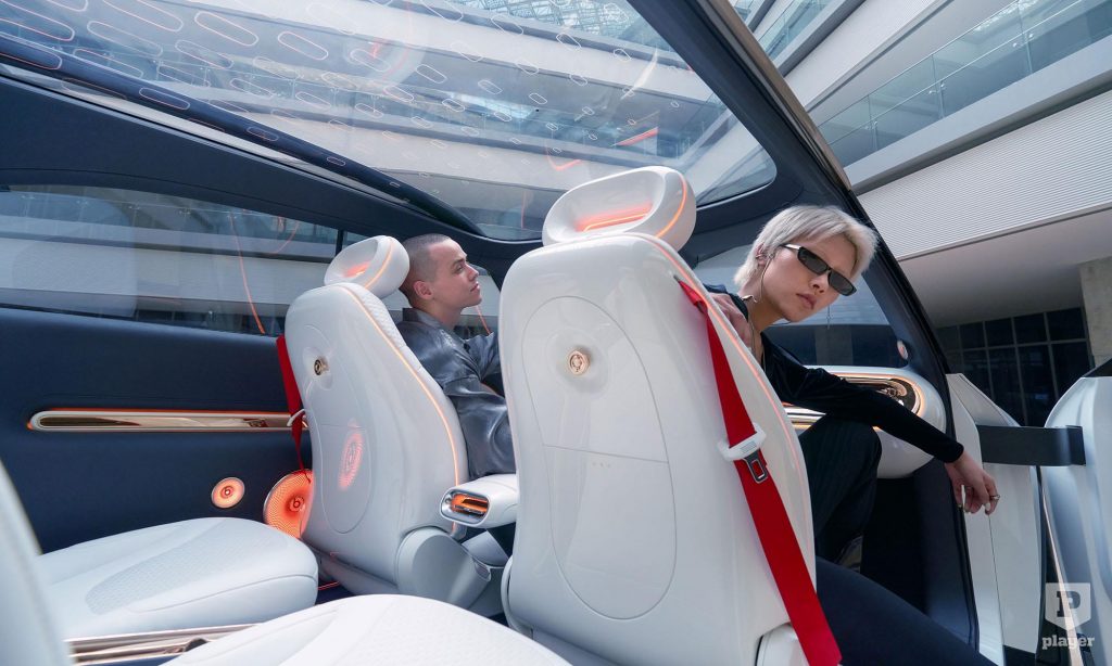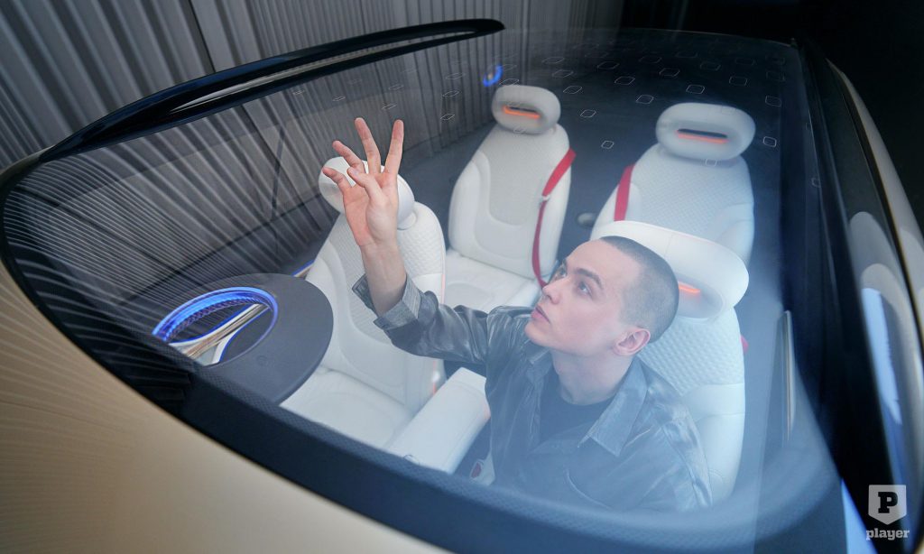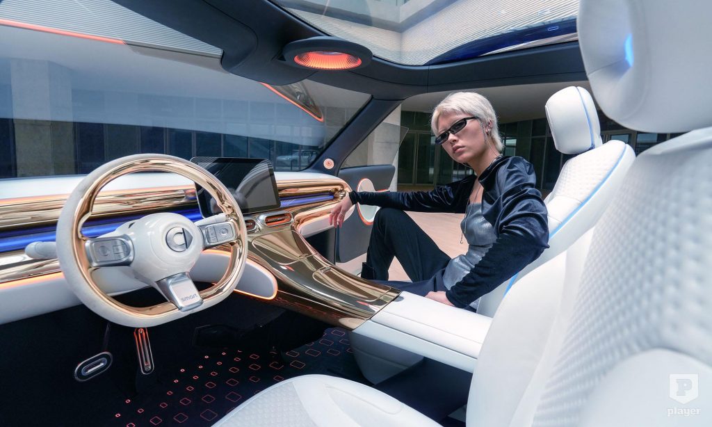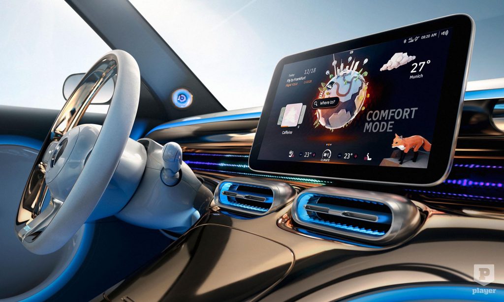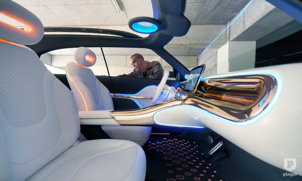 ami ezért nem véletlenül hasonlít a Mercedesére. A fénycsíkkal összekötött hátsó lámpák, valamint a széles műszerfal a közepén a 12,8 colos érintőképernyővel az anyamárka elektromos autóira emlékeztet.