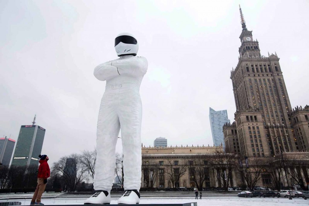A világ legjobb autósműsorának egyik meghatározó, ráadásul legrejtélyesebb figurája Stig. Tízméteres szobra most Varsóban reklámozza a Lengyelországban induló új BBC-csatornát.