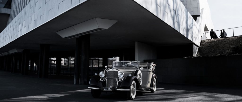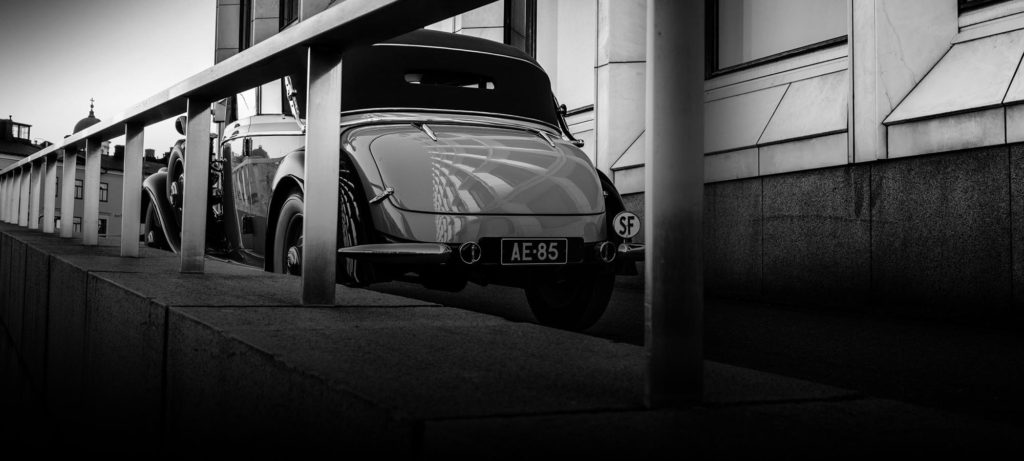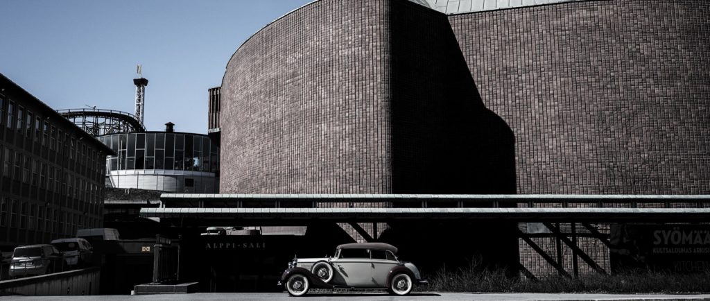 1936-ból származik ez a Mercedes-Benz 200 Cabriolet, ami legalább annyira méltóságteljes, mint a finn funkcionalista építészet legismertebbjének jellegzetes alkotásai, nem véletlenül a társaságukban fotózták a veterán autót.