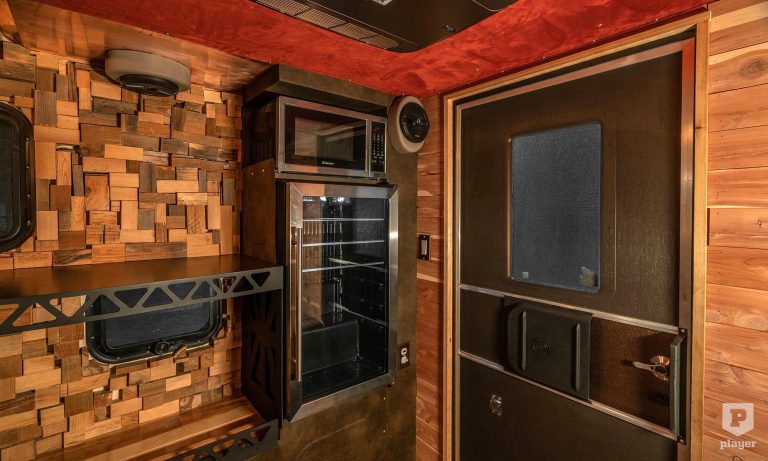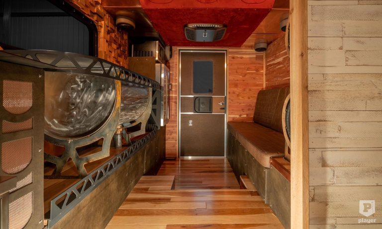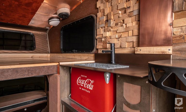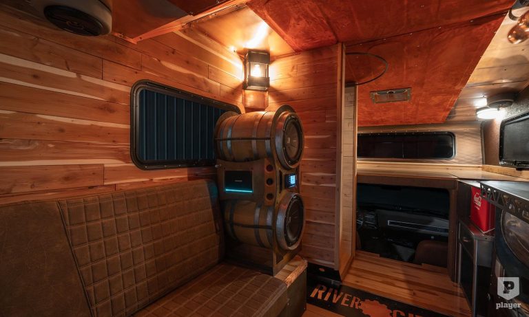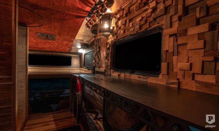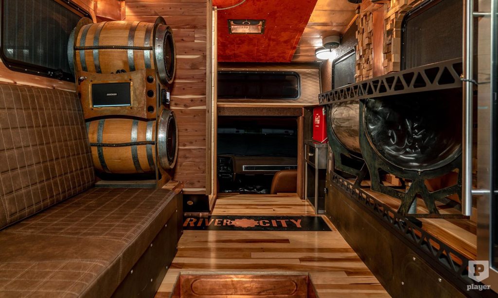 A fapadlóval és lambériával burkolt lakótérben rengeteg az ötletes megoldás, mint a kólahűtőből készült mosogató, vagy a whiskyhordóból épített mélynyomó. A stílusos lakóbuszt dupla ággyal, mellékhelyiséggel, hűtőgéppel, mikróval és tévével is felszerelték.