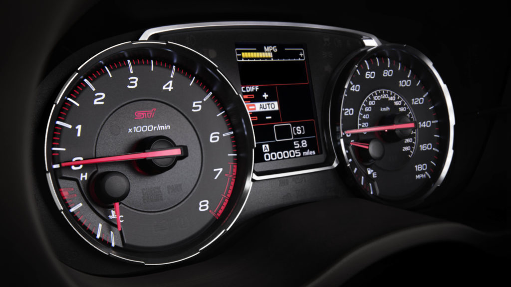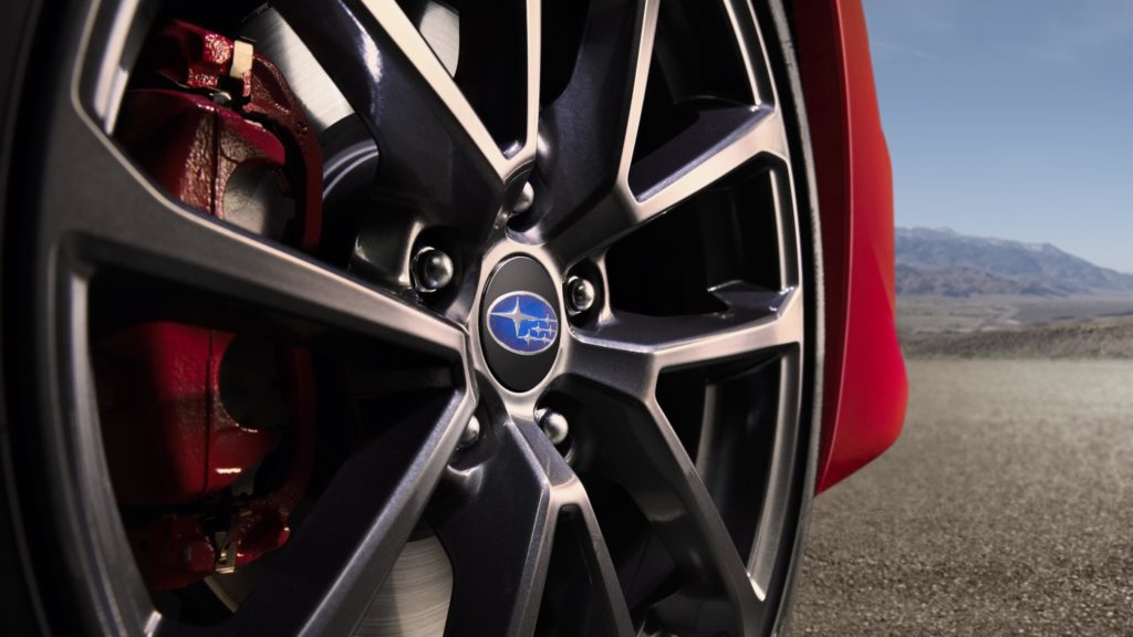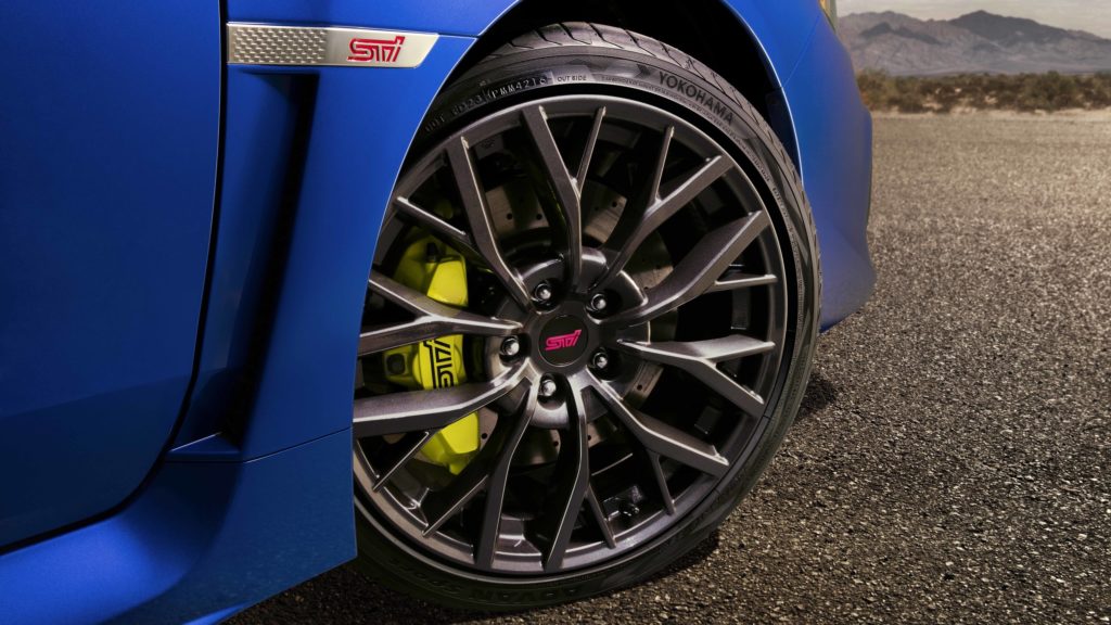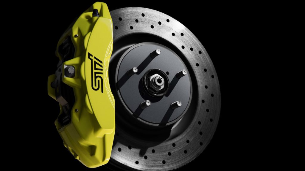 Az STI nagyobb fékeket kapott, az elöl hatdugattyús, hátul kétdugattyús Brembo rendszer lyuggatott tárcsái már olyan nagyok lettek, hogy a szériafelszerelésként adott kerékméretet is megnövelték. Mostantól tehát legalább 19 colos könnyűfém kerekekkel jön az STI, amelyek mögött jól látszanak a sárga féknyergek.