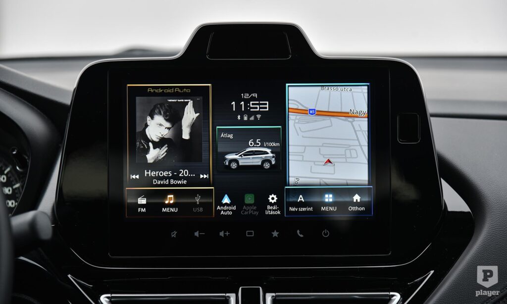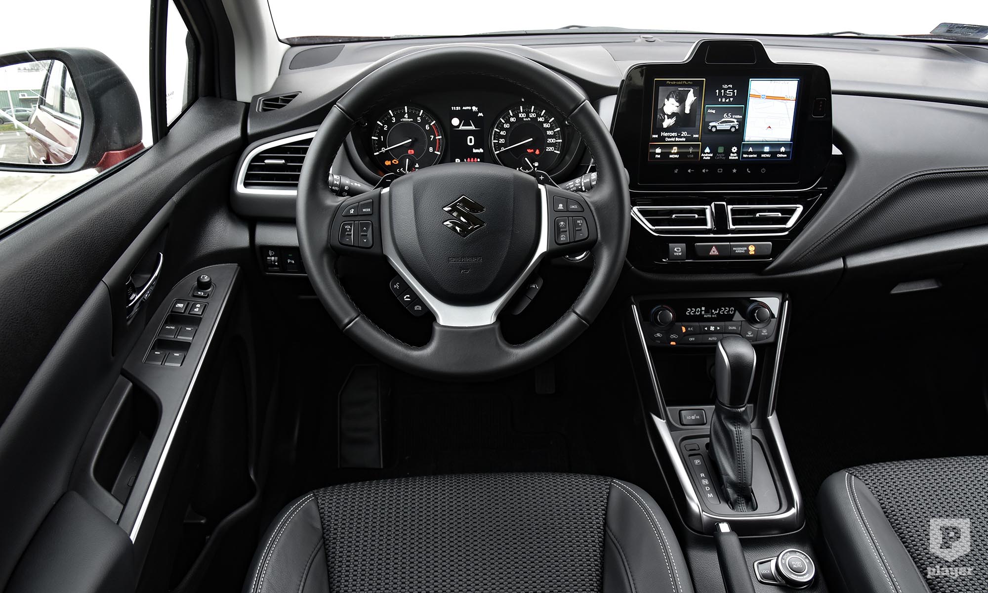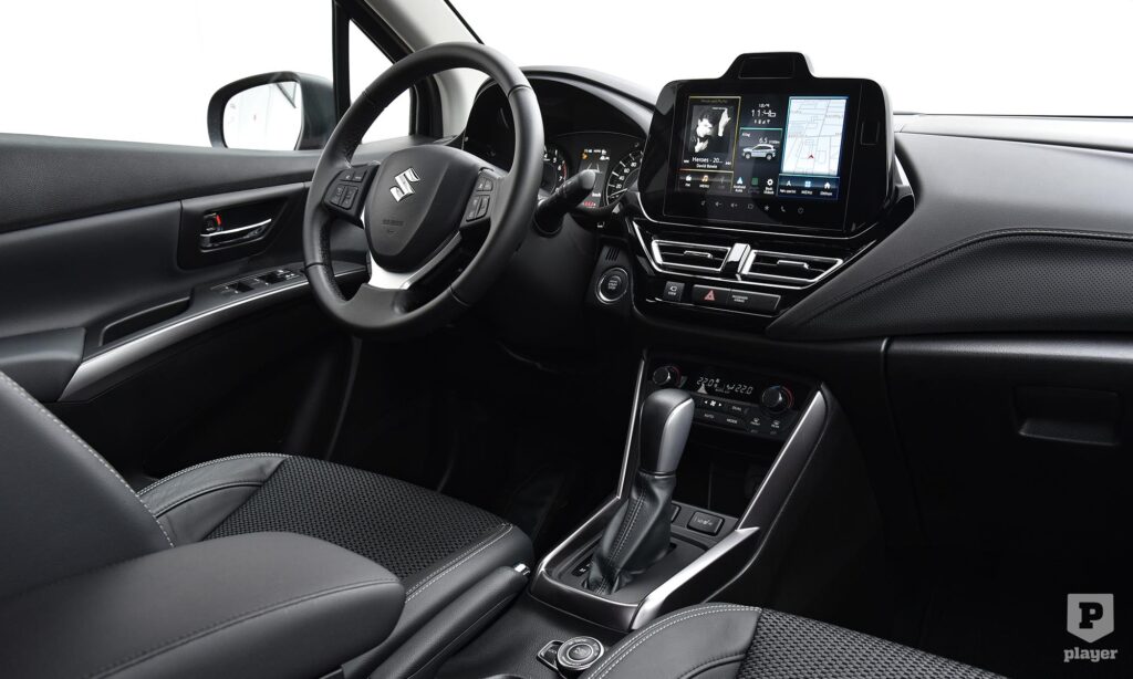 A belső térben nem akartak újra feltalálni mindent, és sokak számára ez az S-Cross legnagyobb vonzereje. A középkonzolon vannak még hagyományos, fizikai gombok, manuális a kézifék, és a műszerfalon is igazi mutatók járnak körbe a klasszikus számlapokon. Az ergonómia példás, minden ott van, ahol keresnénk, a térkínálat megfelelő, a csomagtartó 430 literes értéke is rendben van. Persze a modern idők szele ide is elért, megkaptuk a kötelező táblafelismerő rendszert, és a középkonzol tetején egy új szenzor figyeli a vezető éberségét. Az okostelefon vezeték nélkül is kivetíthető az érintőképernyőre, csak egy fájó pontunk maradt: az egész utastérben csak egyetlen USB-A csatlakozót találunk, ami 2026-ban nagyon kevés.