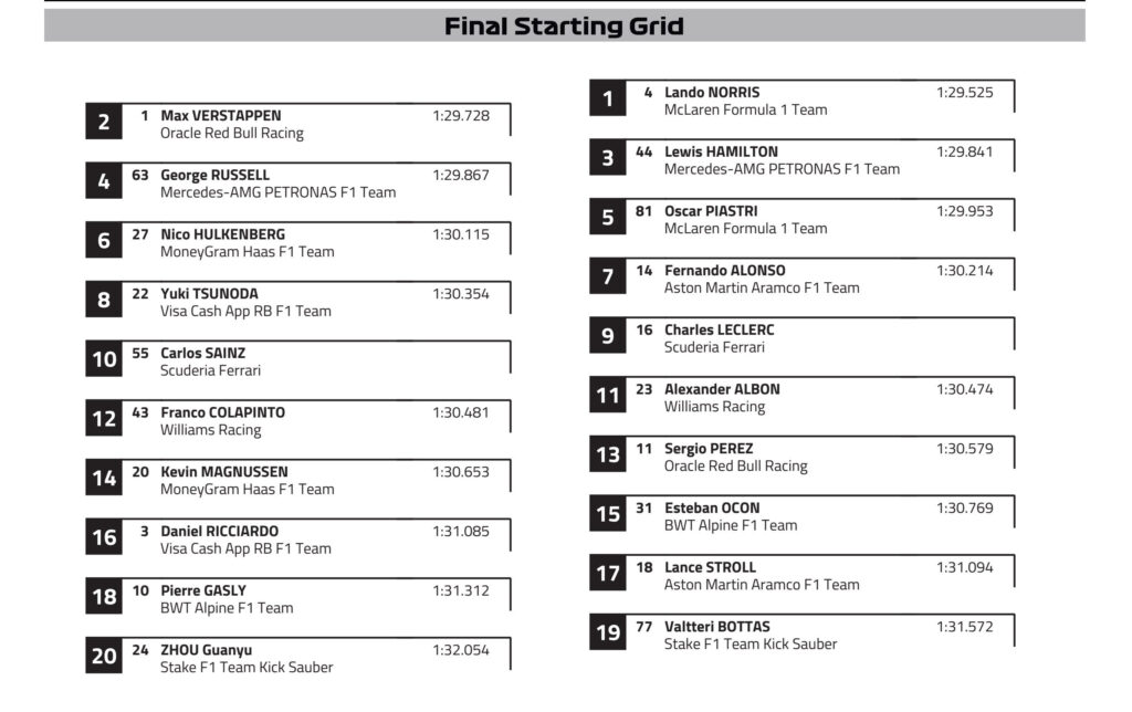 Lando Norris szerezte meg a pole pozíciót a Szingapúri Nagydíj időmérőjén, mellőle pedig Max Verstappen indulhatott. A rajtrács: