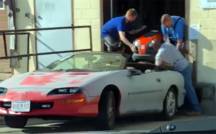 Sőt, valószínűleg célba is ért, mert a videón már az látható, ahogy megpróbálja leügyeskedni a pickupról a gépet. Mivel azonban a pickup annyira magas, hogy a közvetlenül nekitámasztott rámpa vagy túl meredek, vagy túl hosszú lenne, egy utánfutó-trélert is igénybe vettek (rejtély, hogy a szállításhoz miért nem).