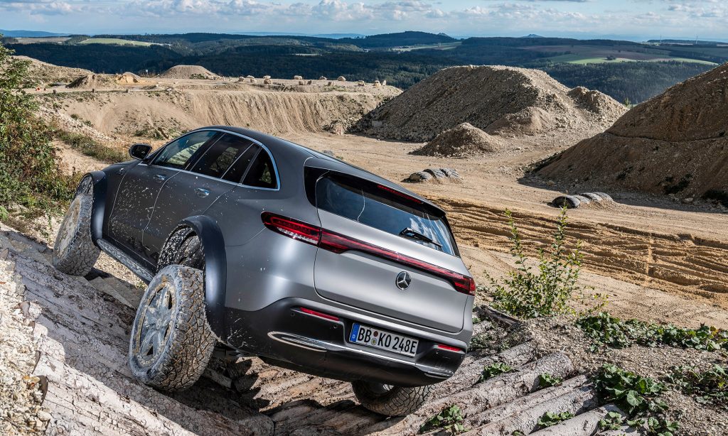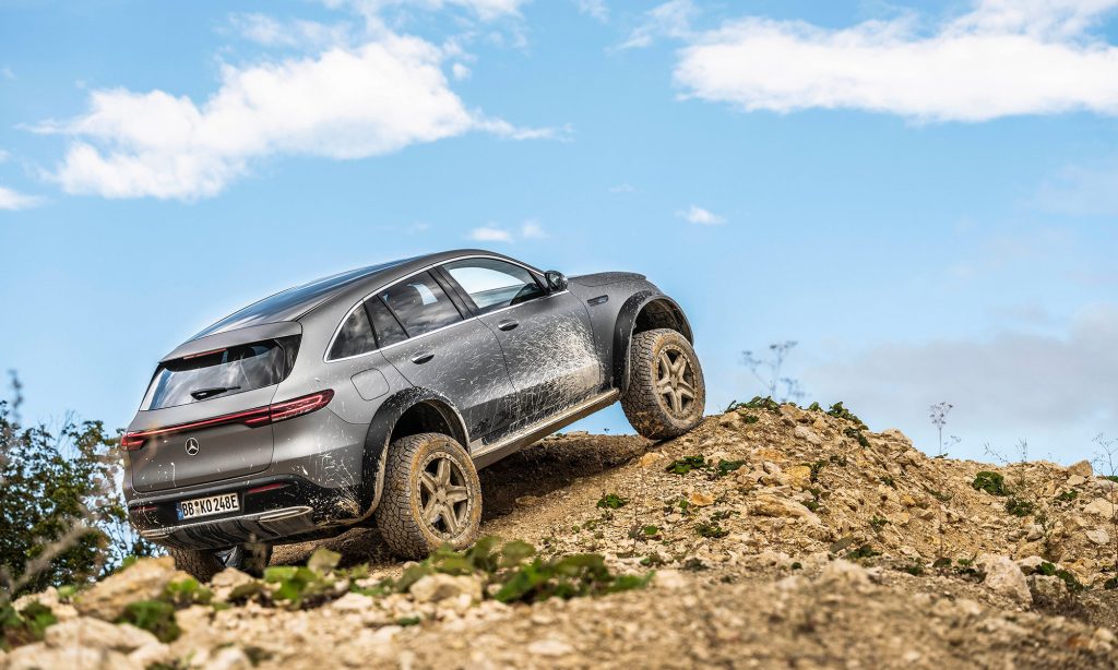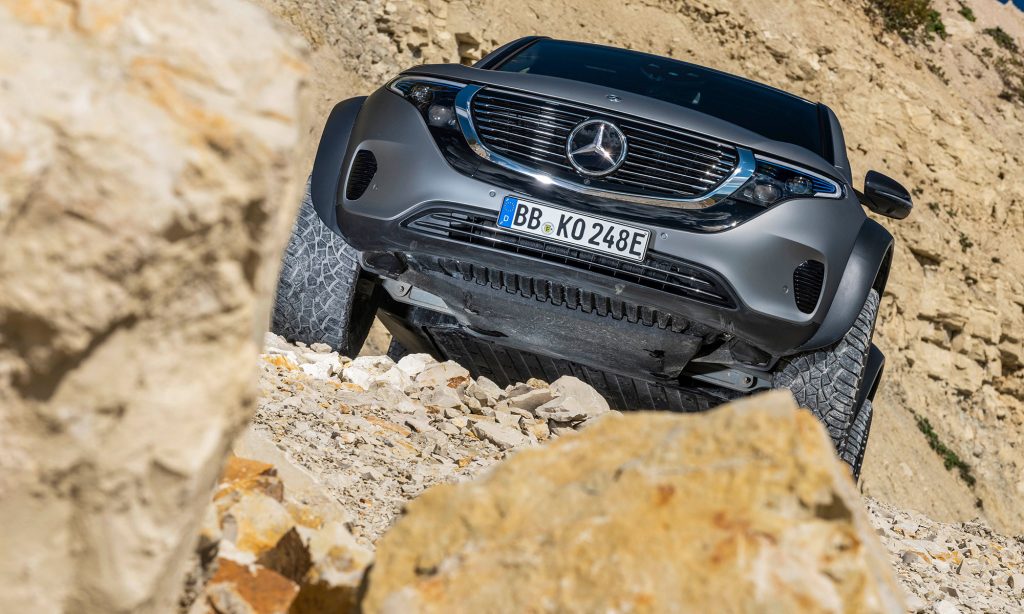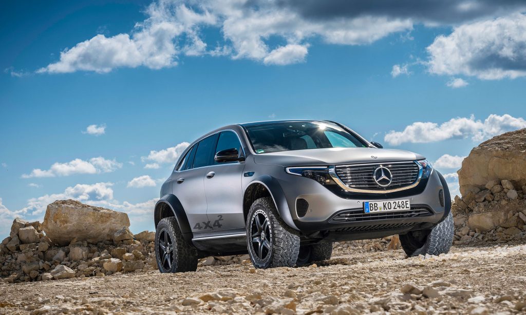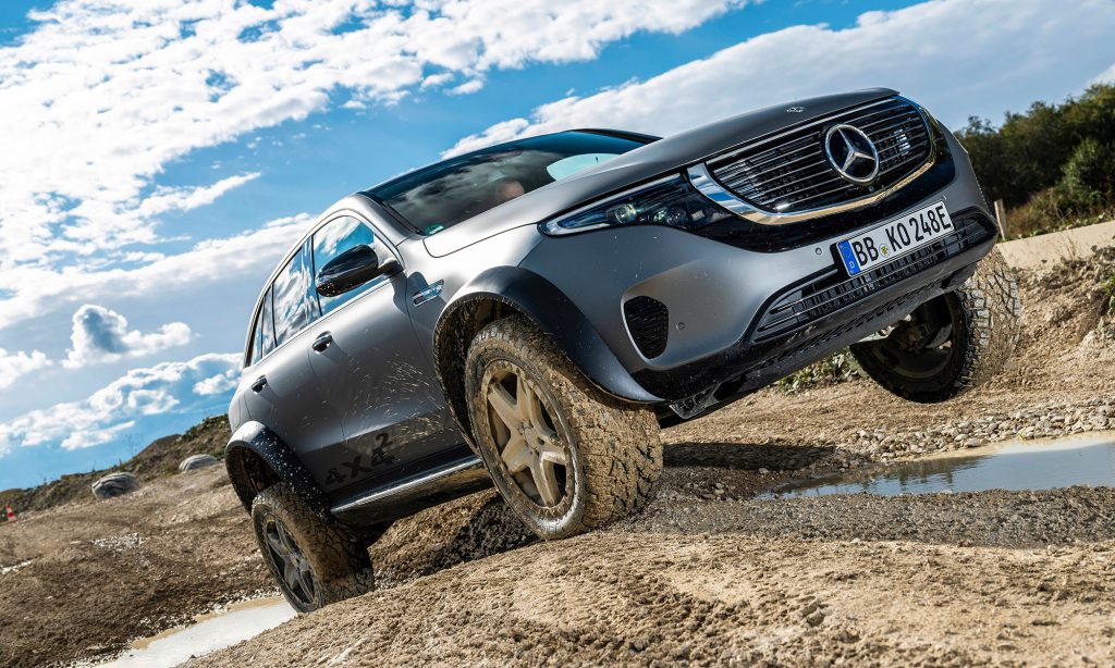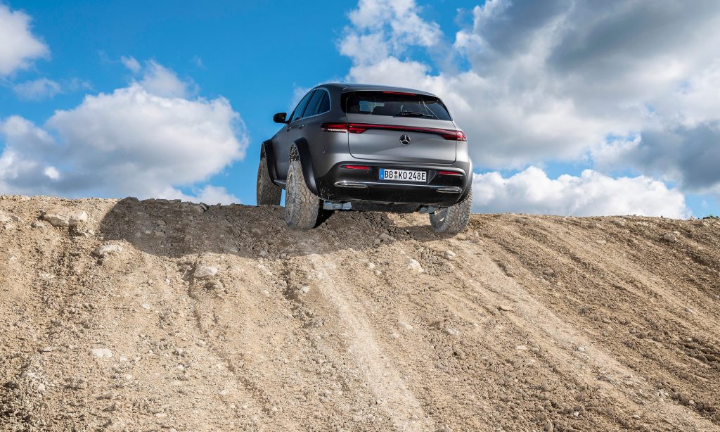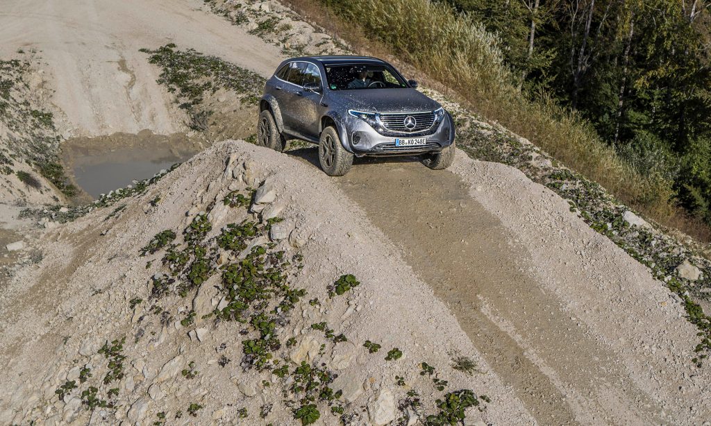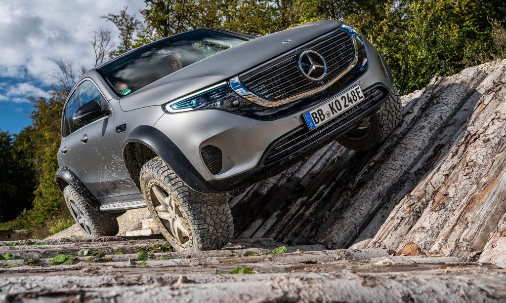 A szabadidő-autók nem igazi terepjárók, de ez alól kivételt jelent az elektromos Mercedes-Benz EQC prototípusa, ami ezzel az alaposan megemelt futóművel a nagyobb akadályoktól sem retten vissza.