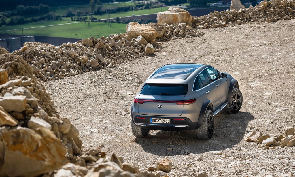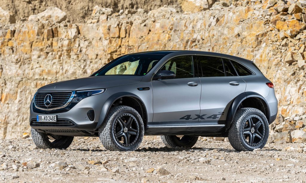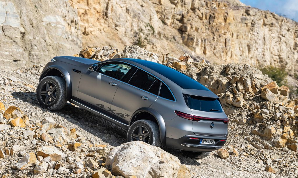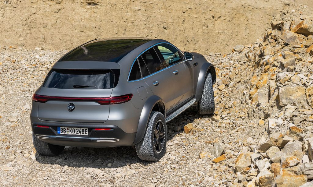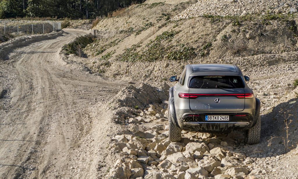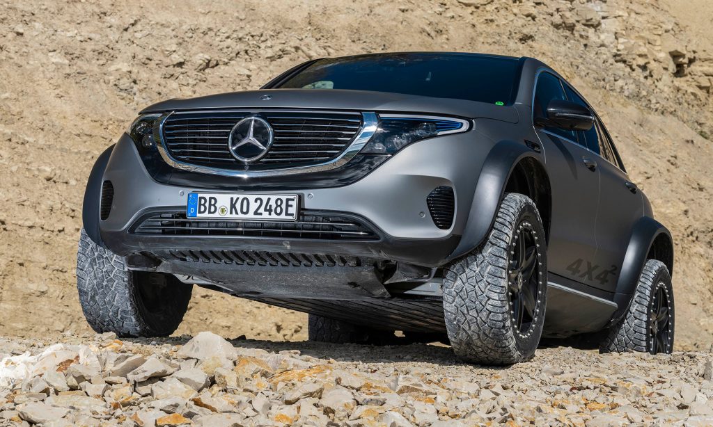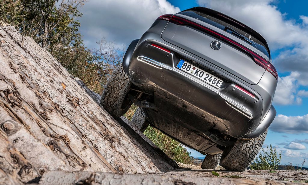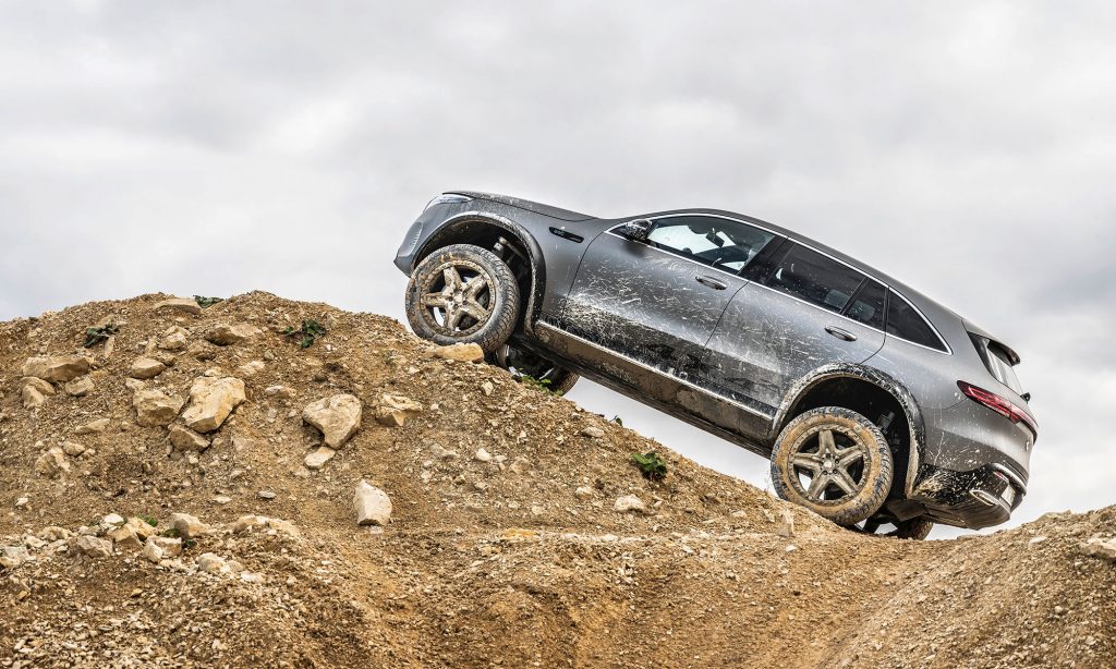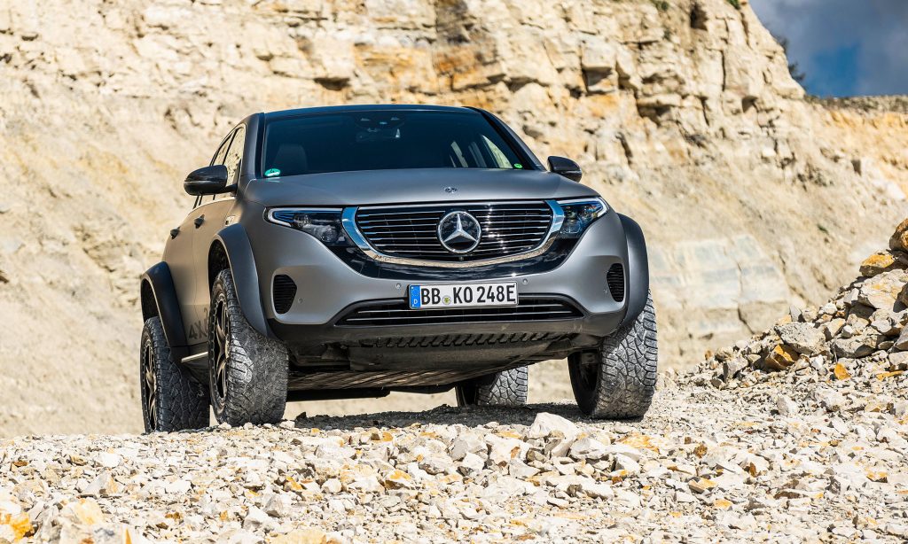 A szabadidő-autók nem igazi terepjárók, de ez alól kivételt jelent az elektromos Mercedes-Benz EQC prototípusa, ami ezzel az alaposan megemelt futóművel a nagyobb akadályoktól sem retten vissza.