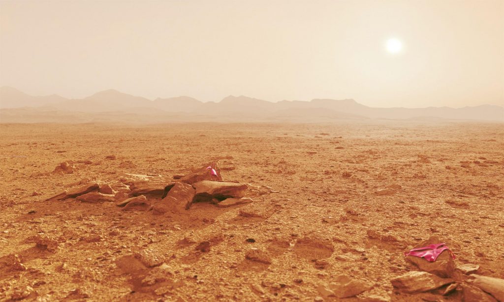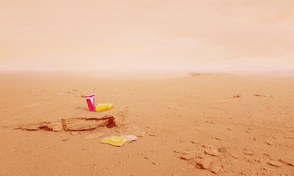 Life on Mars címmel a román grafikus Andrei Lacatusu azt képzelte el, milyen lenne, amikor a SpaceX közreműködésével az ember végre megérkezik a Marsra. Nem fest túl szimpatikus képet róla, ugyanis a vörös bolygó felszíne éppen olyan elhanyagoltan néz ki, mint bármelyik kietlen táj a Földön: eldobált cigaretták, széttört üvegek, üres gyorséttermi dobozok hevernek szerteszét.
