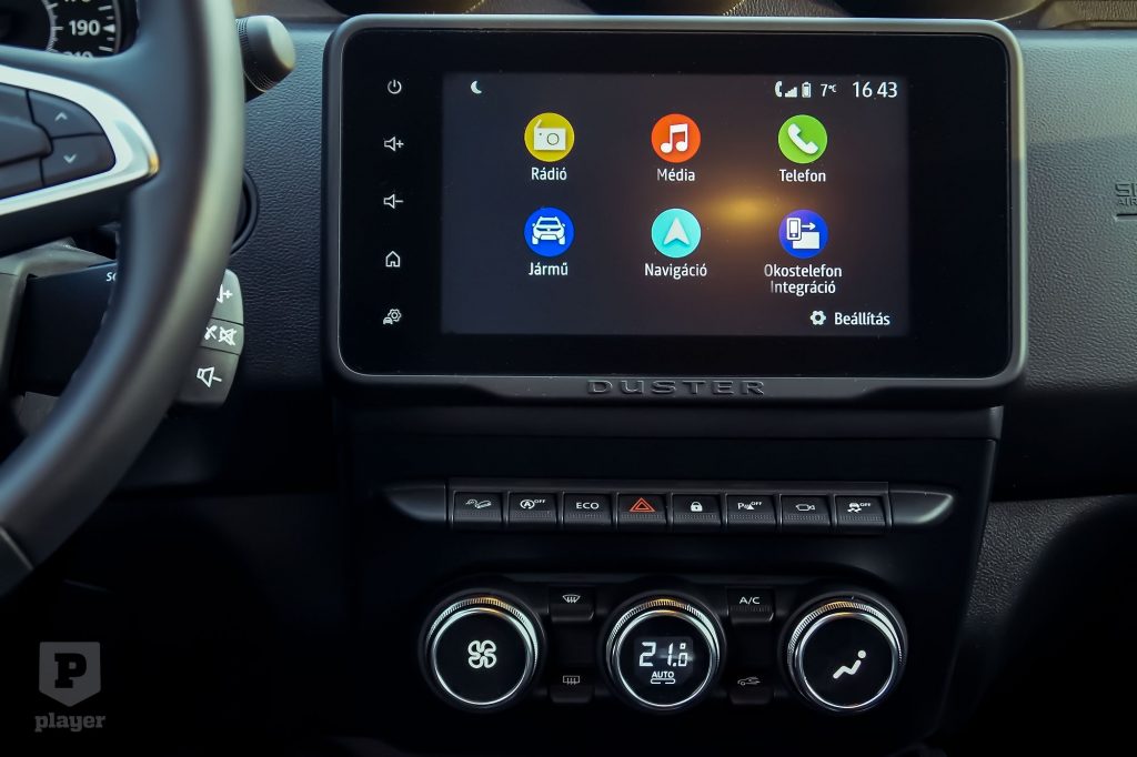 Érdekes, hogy bakancsforma, magas fordulat, dízelhang ide vagy oda, a Dusterben autópályán, 130-nál is lehet hallgatni a rádiót vagy beszélgetni. A hathangszórós audiorendszer hangminősége nyilván nem kiváló, legfeljebb csak közepes, viszont hallottam már ennél sokkal rosszabbat sokkal drágább autókban is. A konnektivitás (a modellfrissítés óta Apple Car Play és Android Auto, kábel nélkül is) működik, a navigáció képe primitív, de az is működik. Az érintőképernyő képe ugyan fakó, a mutatós műszeregység oldschool, de minden használható.