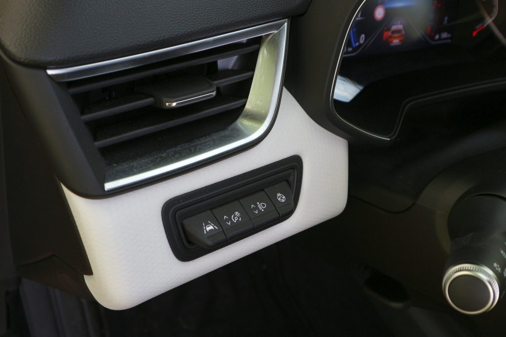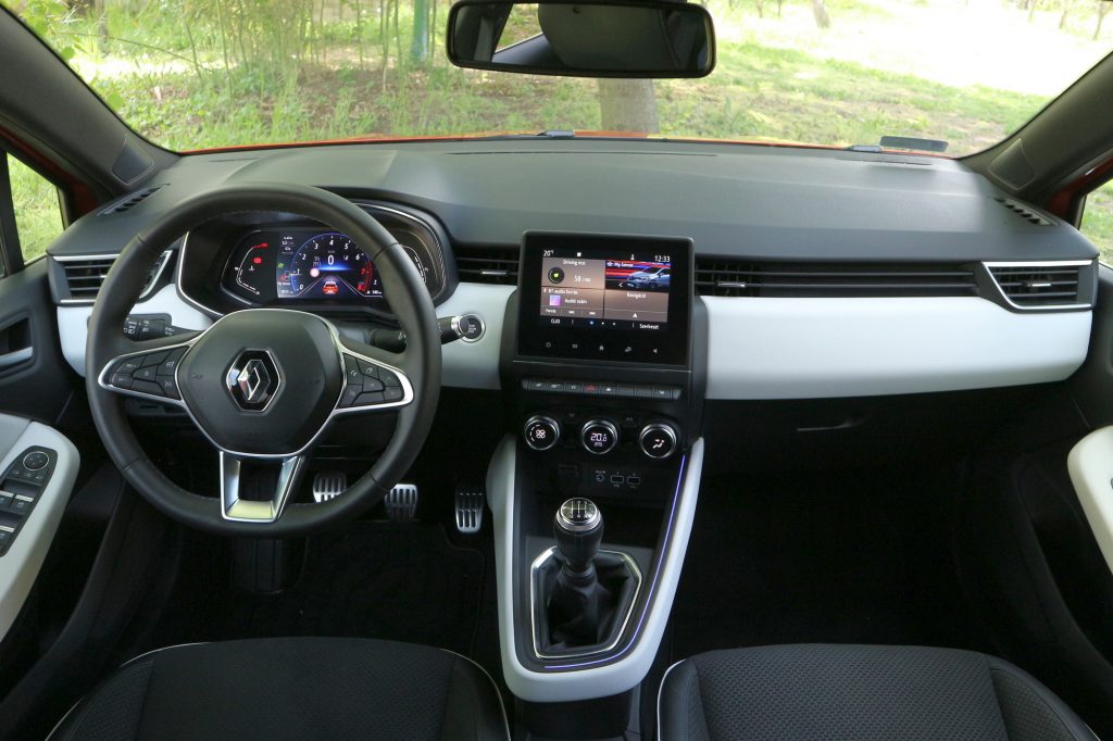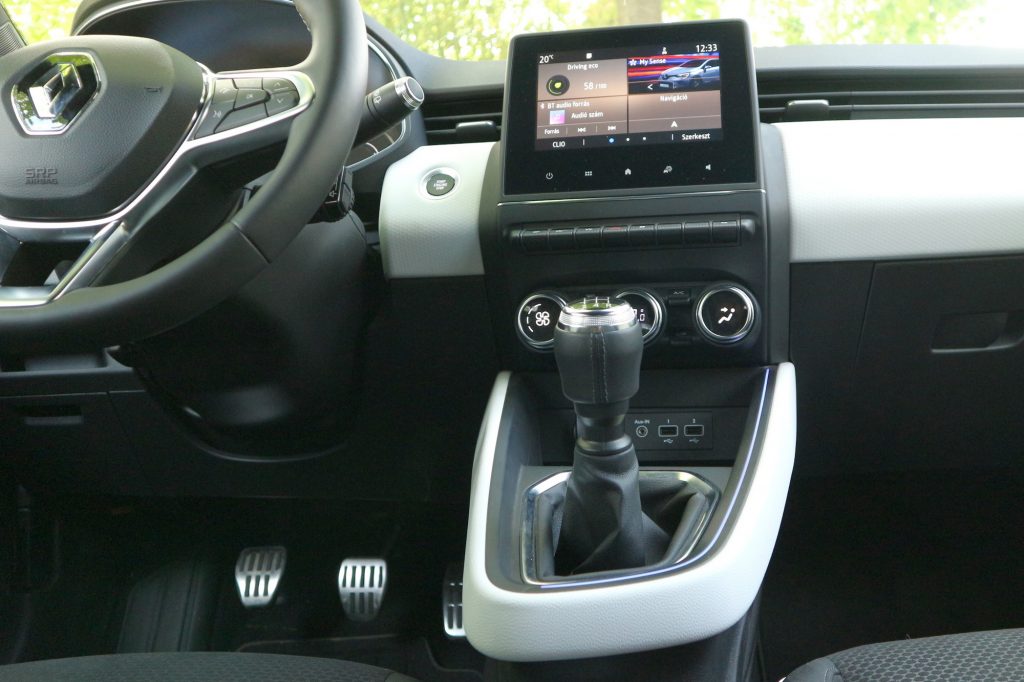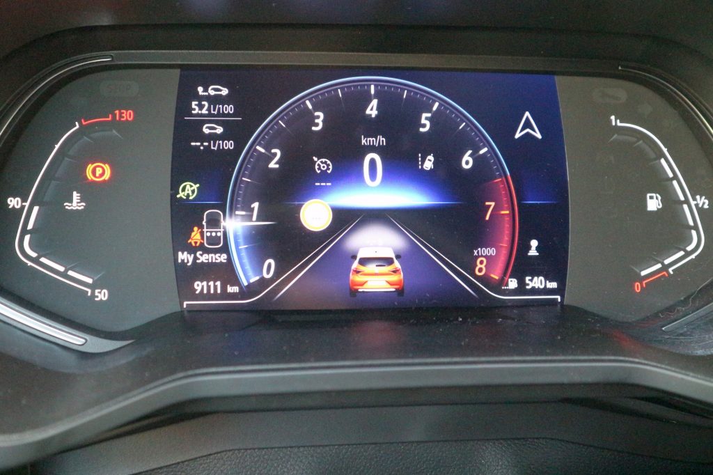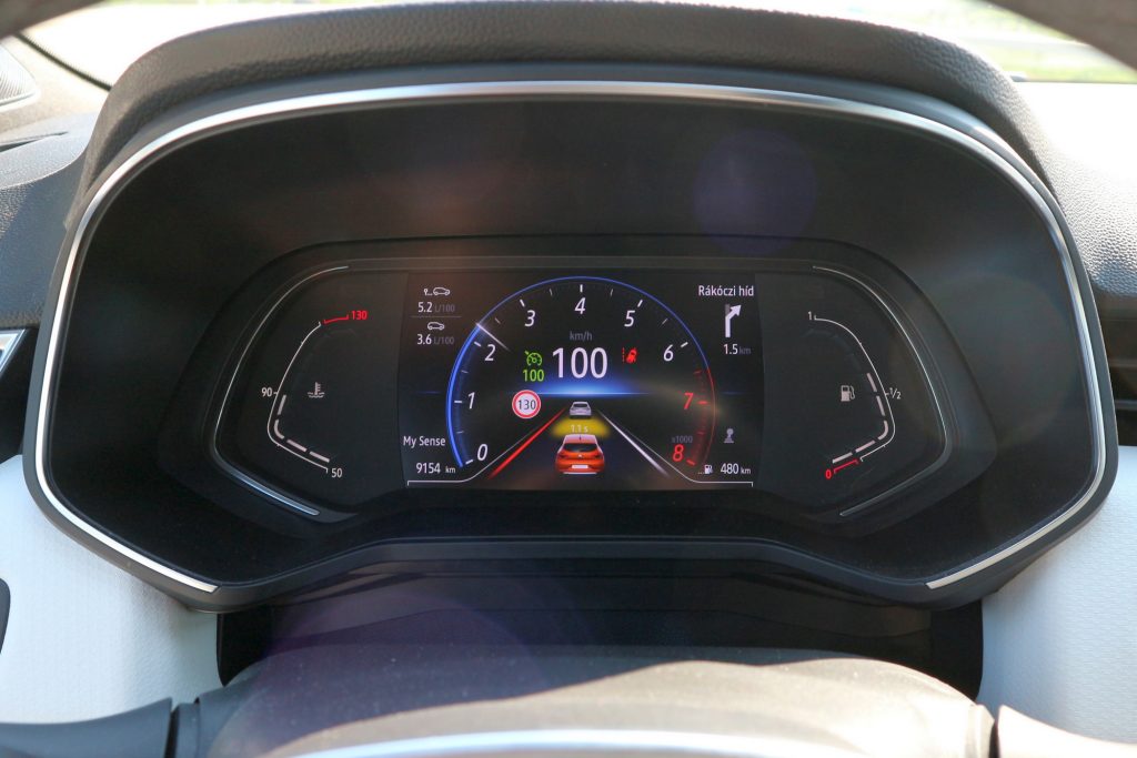A Clio műszeregysége a legolcsóbb változatban analóg, mutatós órás, a legdrágábban pedig a navigáció képét is megjeleníteni képes 10 collos virtuális panel. Ebben a kocsiban a köztes megoldás szerepelt: digitális műszeregység, átlátható, érthető adatmegjelenítéssel.